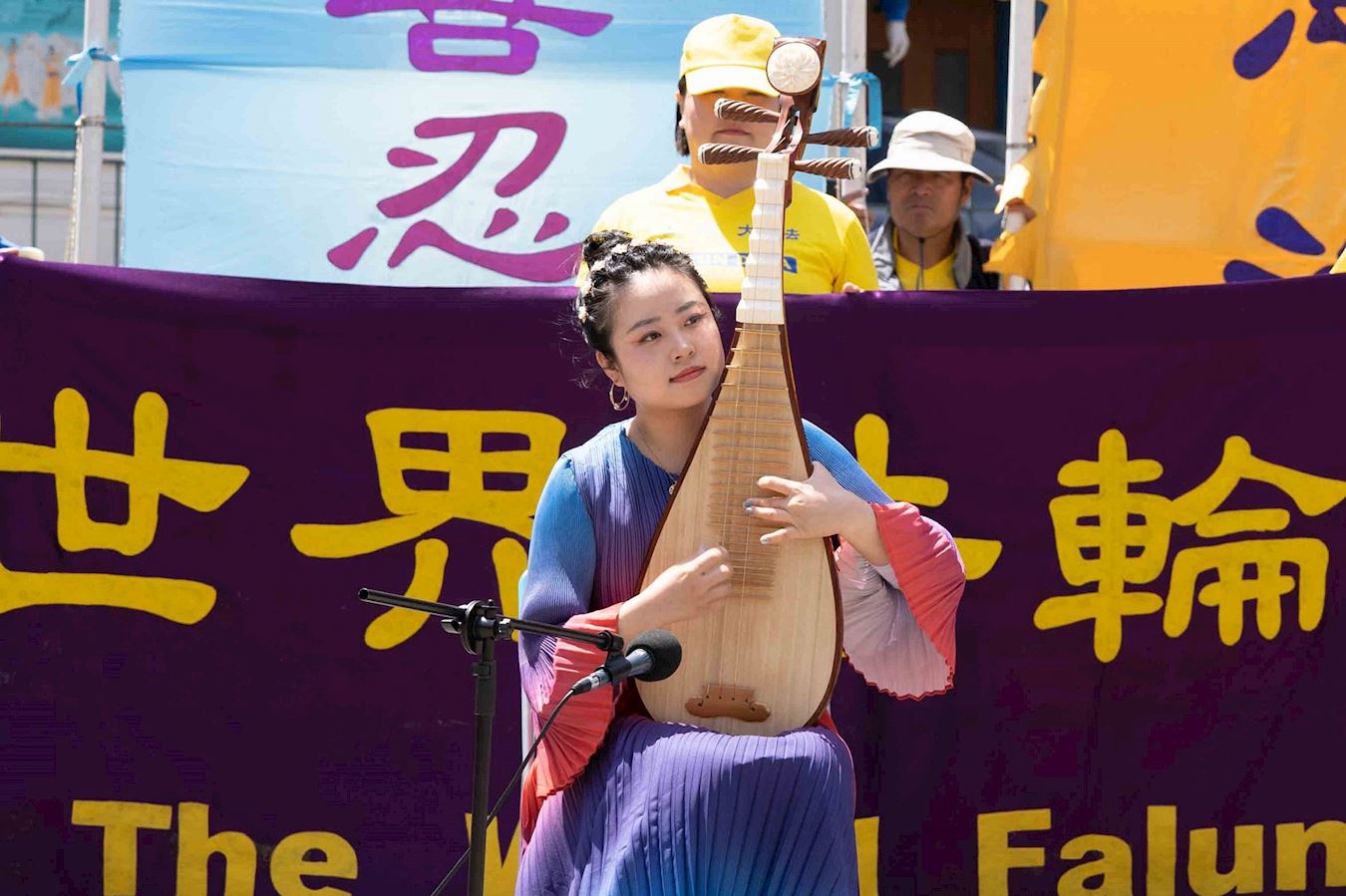 Američki West Tian Guo Marching Band je započeo manifestaciju izvođenjem nekoliko pjesama, nakon čega su praktikanti dijelili lična iskustva o pozitivnim promjenama u njihovom zdravlju i dobrobiti kroz prakticiranje Falun Dafa. Uslijedio je plesni komad “Taichi Učitelj”, recital poezije, solo recital kineskog muzičkog instrumenta pipa i nastupi dobošara.