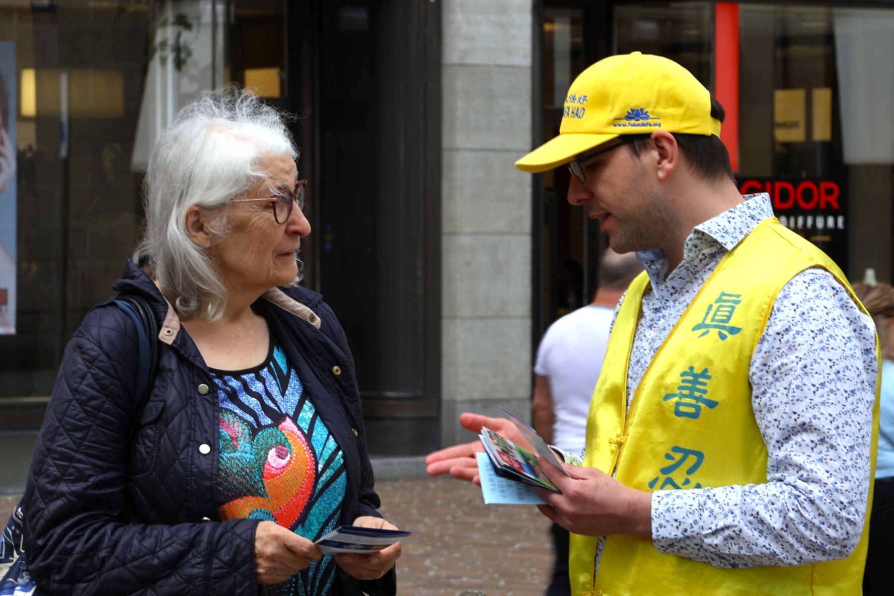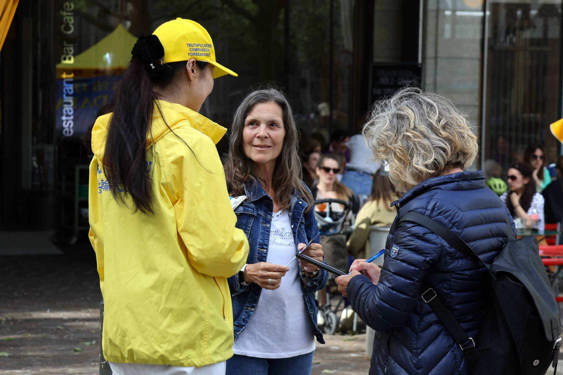 Gosti koji su obedovali u restoranima i prolaznici oko trga mogli su da čuju o Falun Dafi i Dafinim principima istinitosti, blagosti, trpeljivosti.