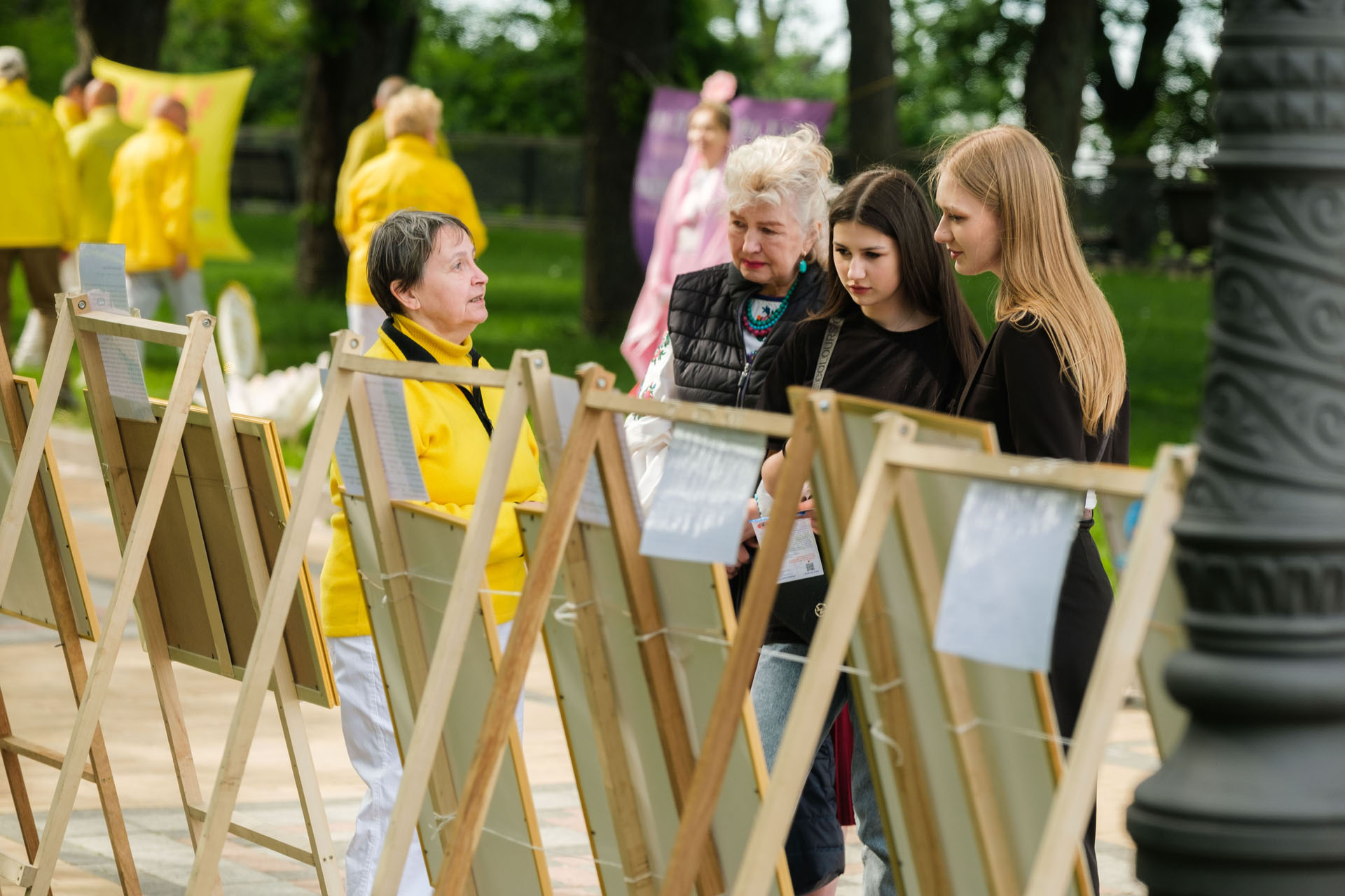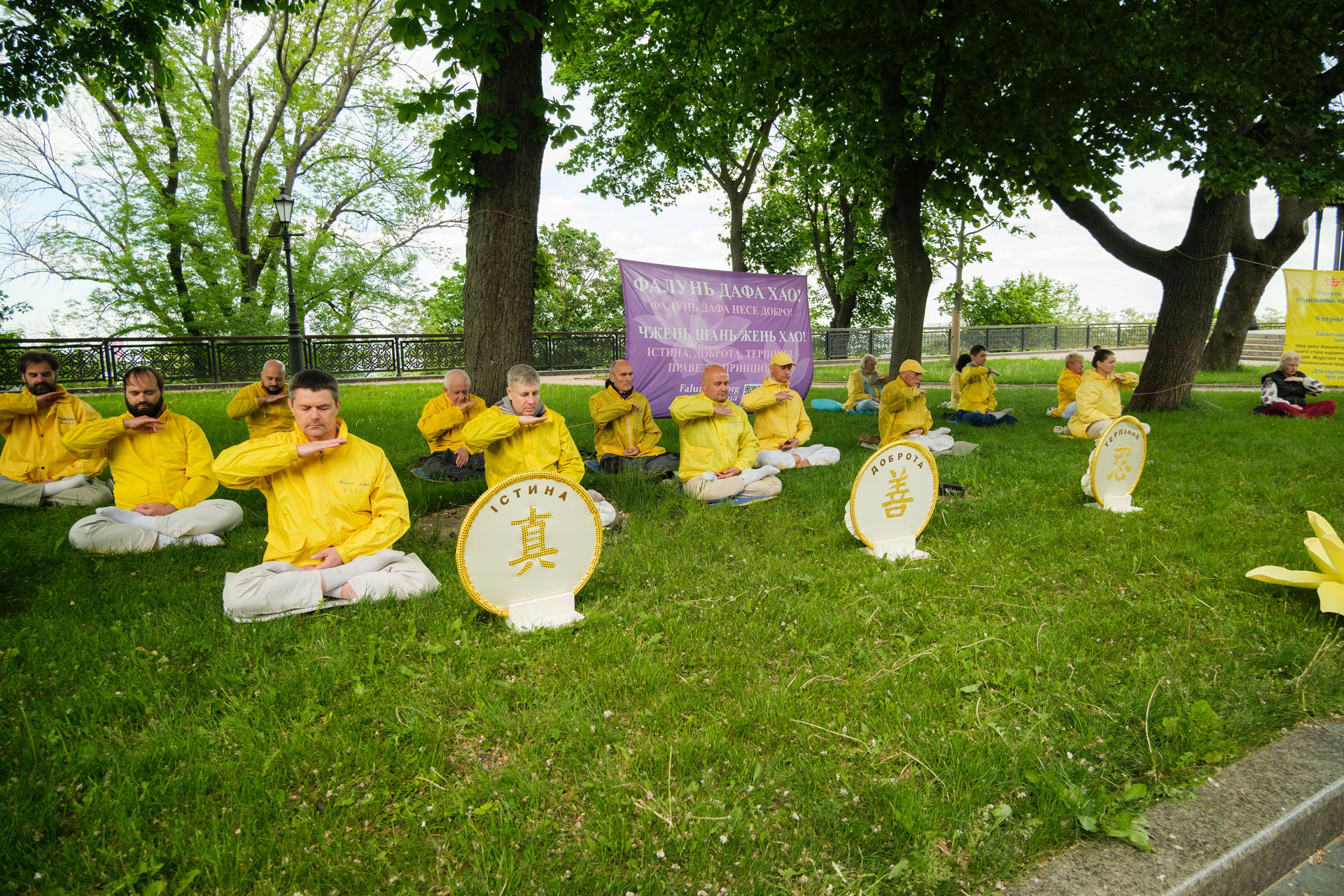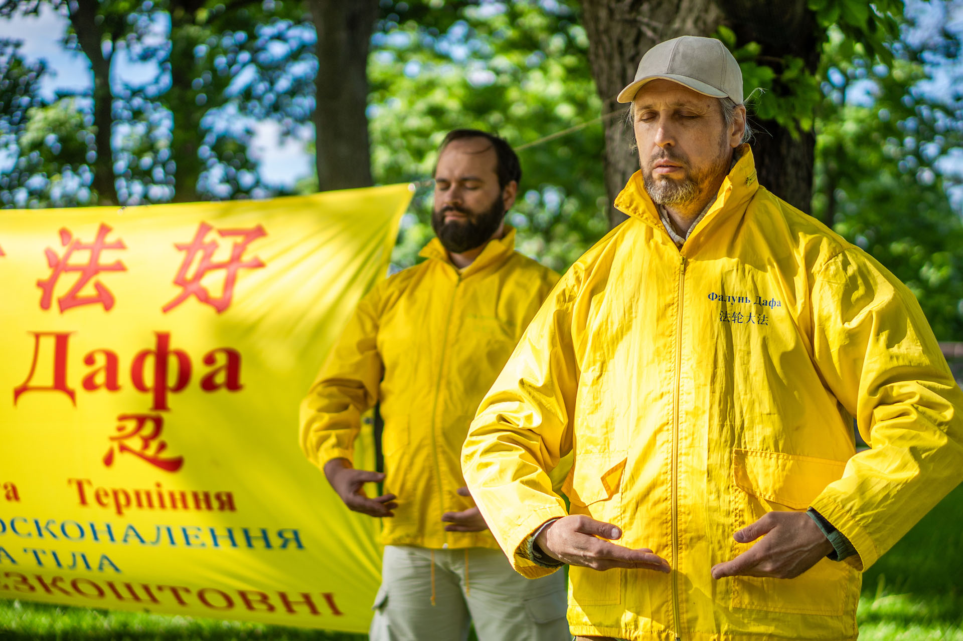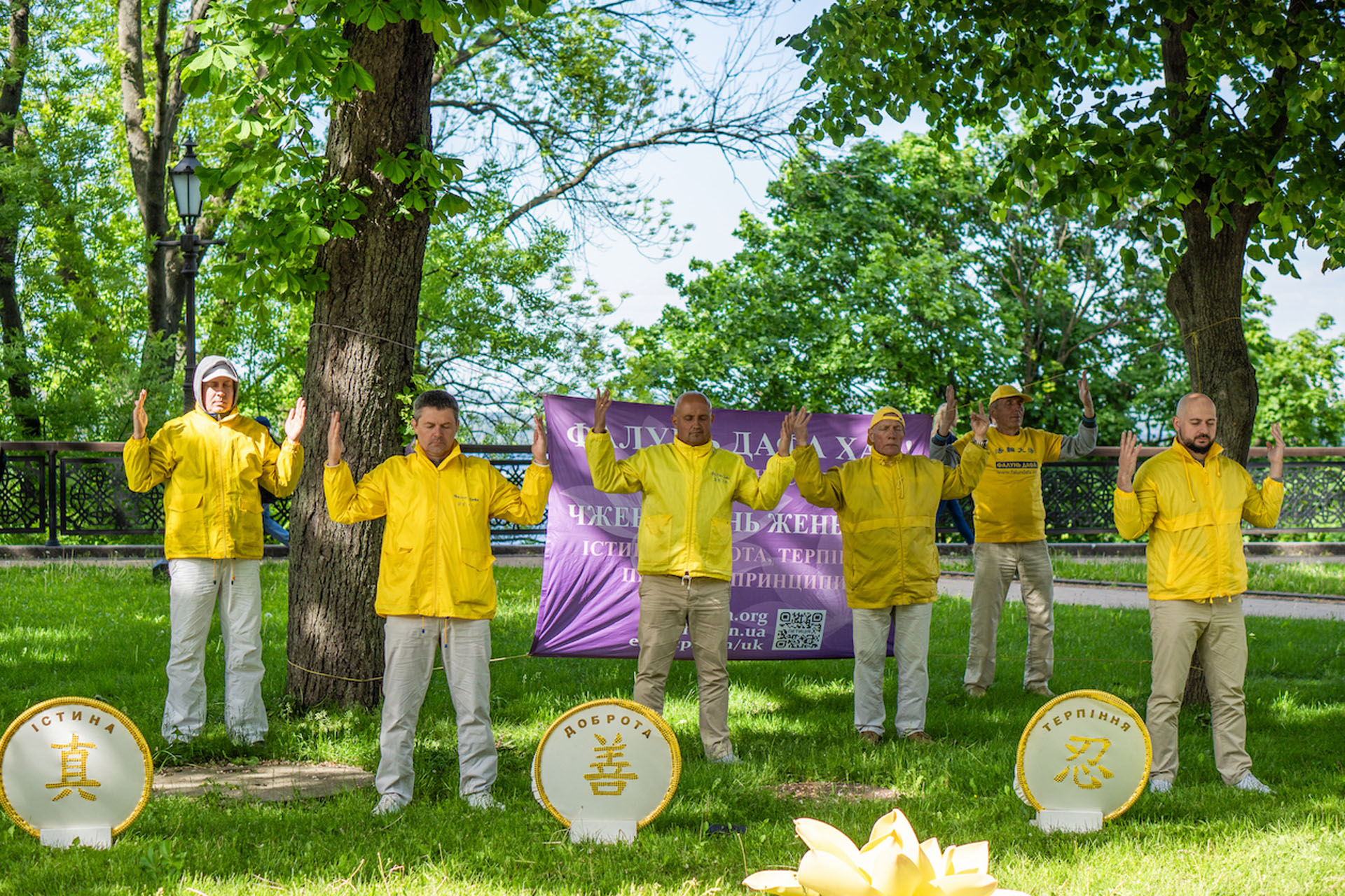 Praktikanti iz različitih dijelova Ukrajine okupili su se, 11. maja 2024., u parku Volodimirska Gorka u centru Kijeva kako bi proslavili 25. Svjetski dan Falun Dafa.