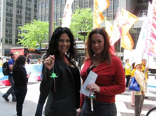 Sara Obyle (desno na slici) gledala je paradu sa svojim kolegama i poželjela doznati više o Falun Gongu.