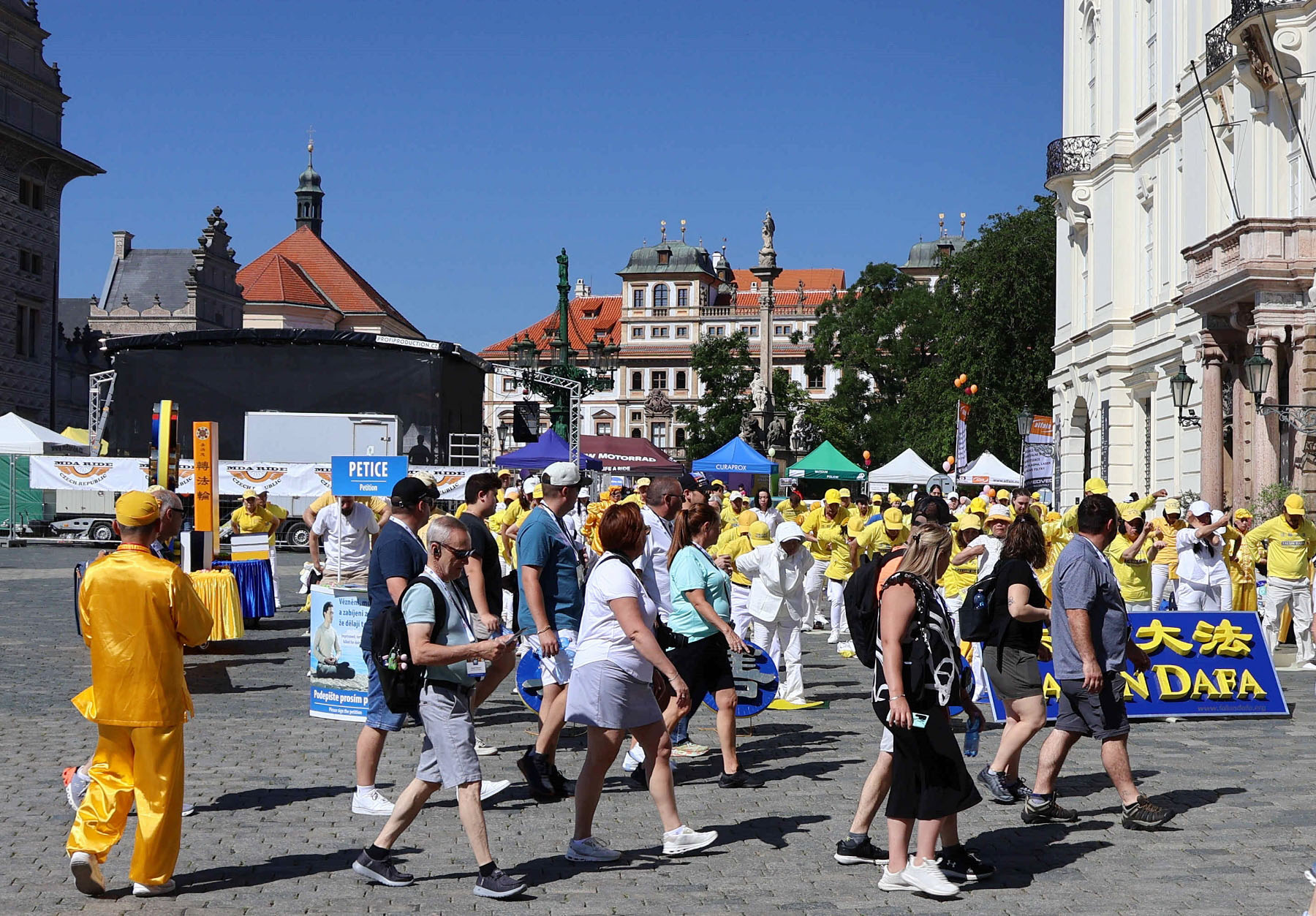 Sunčanog 8. juna, brojni turisti su se okupili na Hradčanskom trgu kako bi posjetili Praški dvorac i gledali smjenu straže. Za razliku od gužve u Zamku, grupa Falun Dafa praktikanata obučenih u žute košulje tiho je na uglu trga meditirala uz umirujuću muziku.
