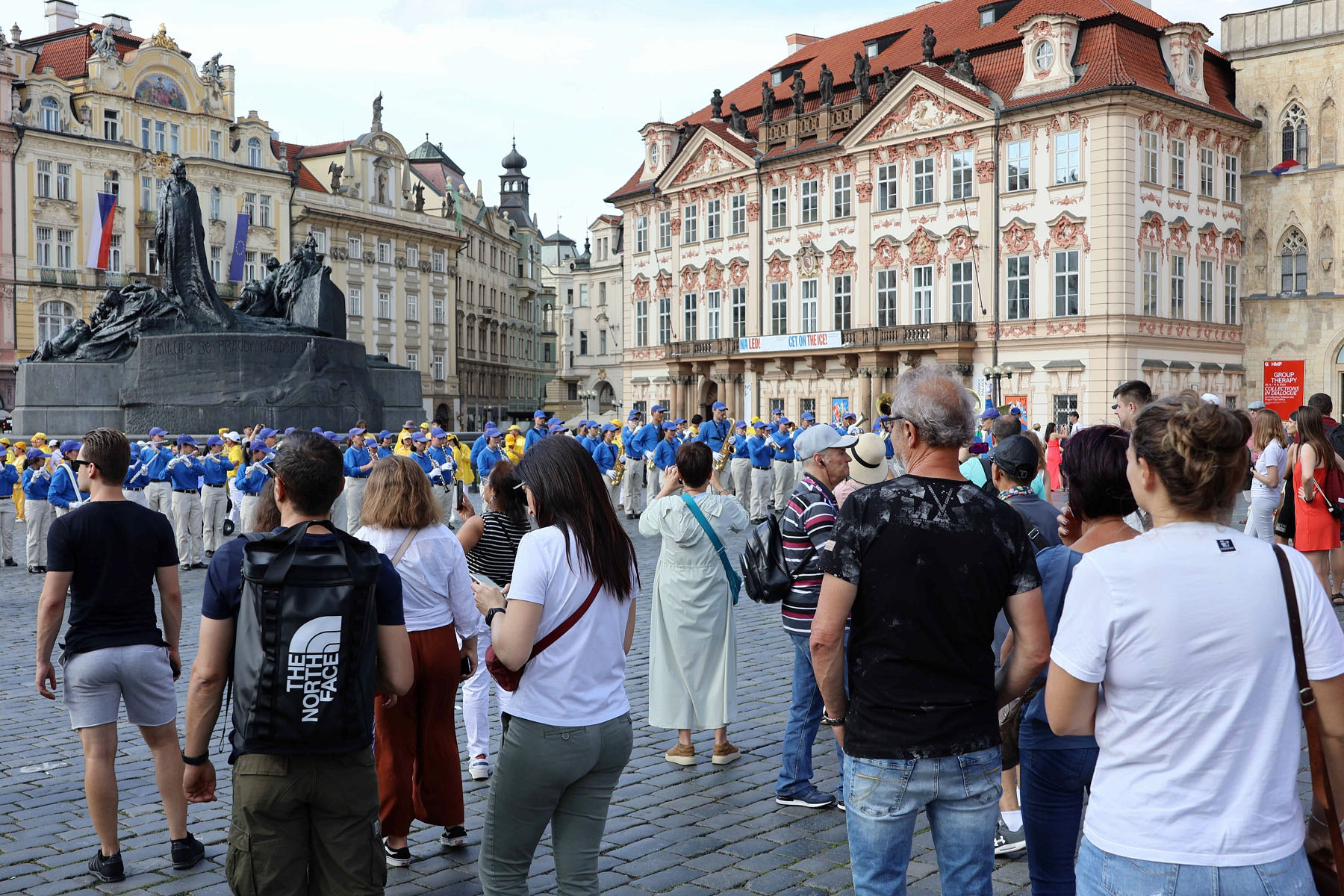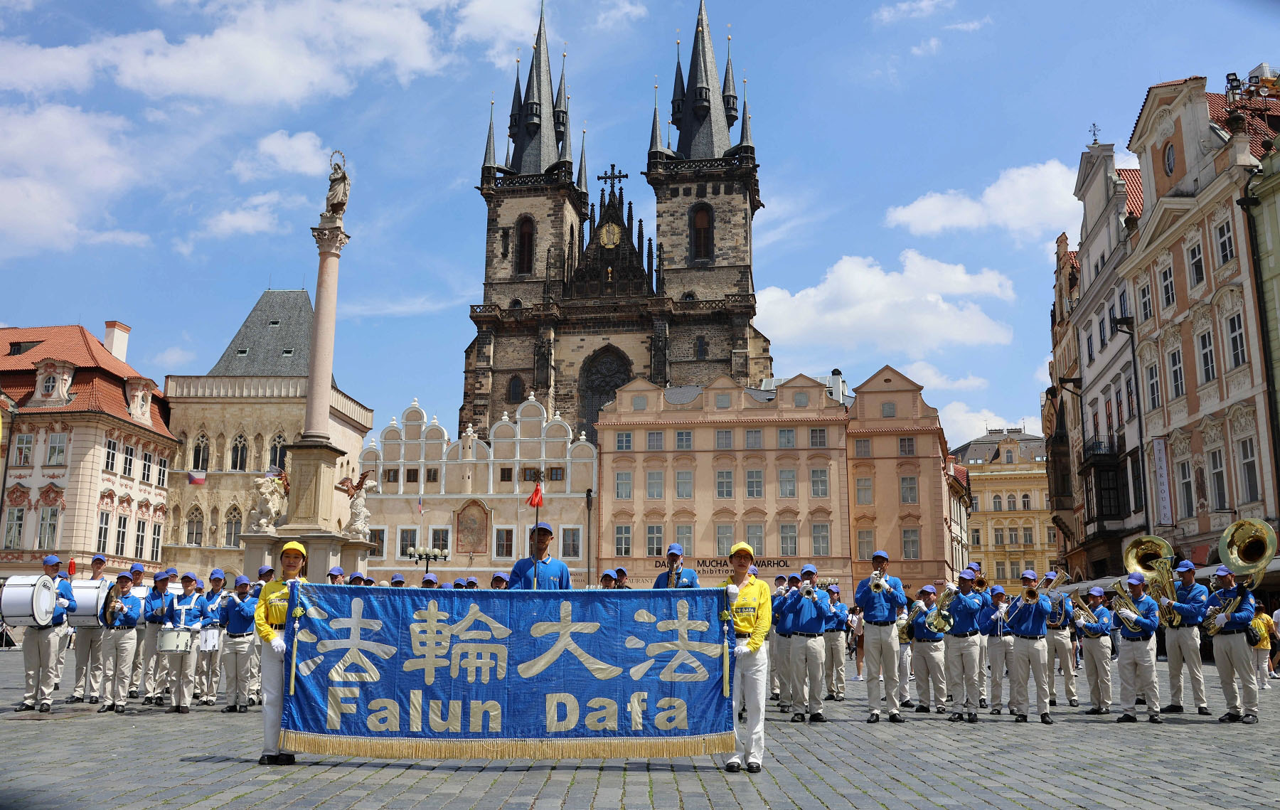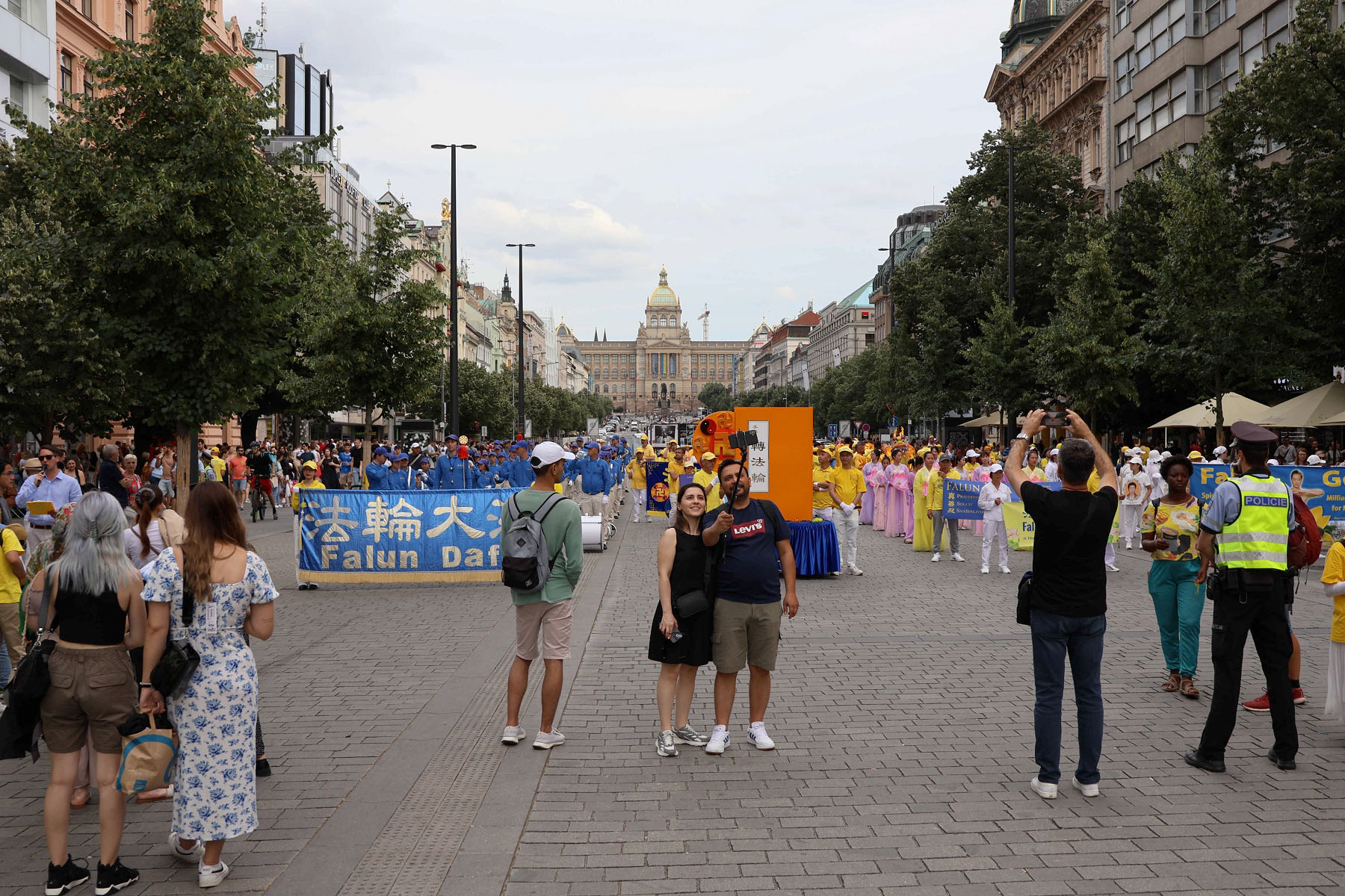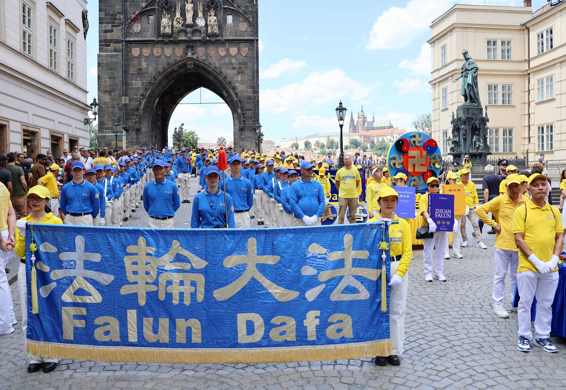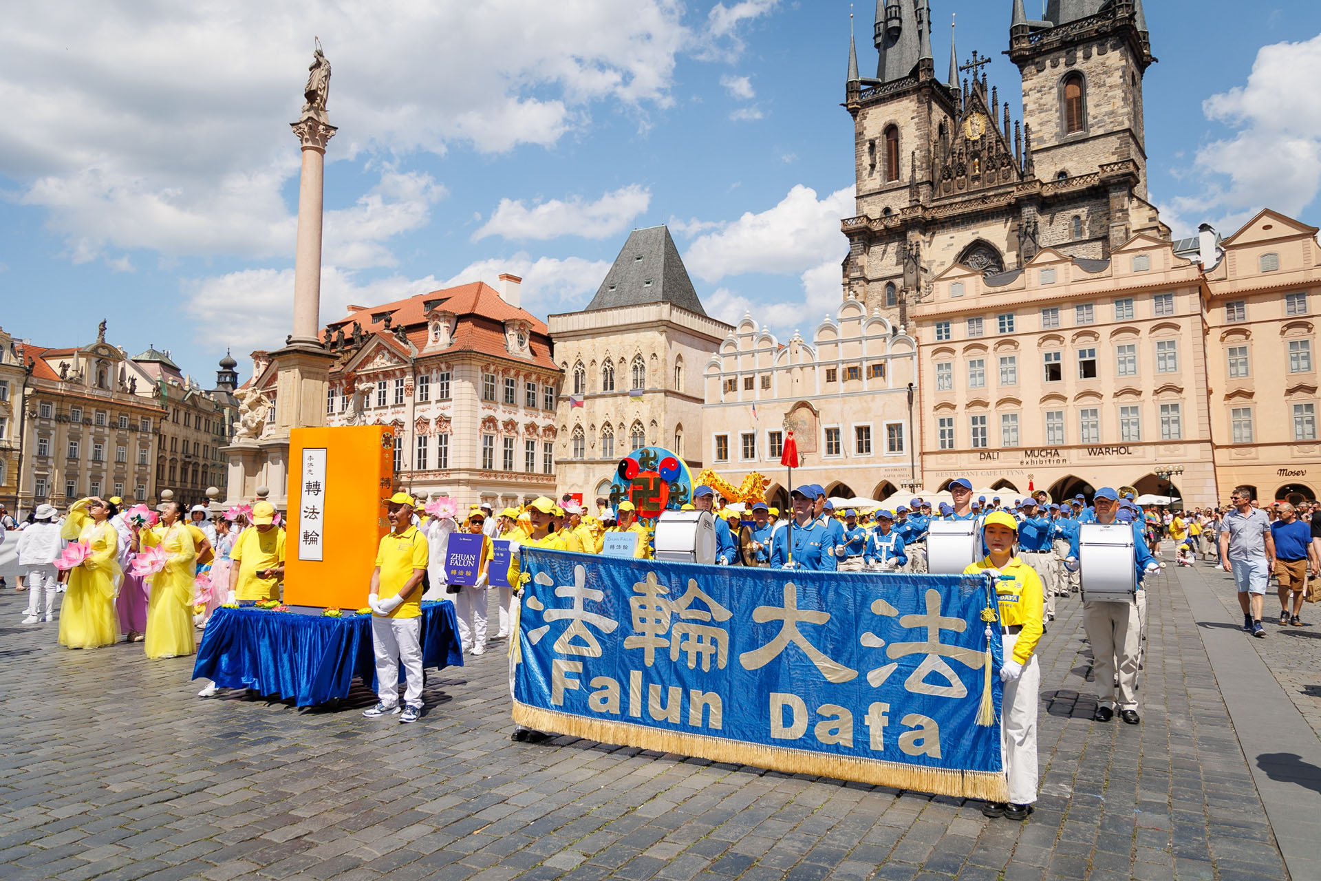 Parada je krenula sa Hradčanskog trga, prešla Karlov most i na kraju stigla do Starog gradskog trga gdje su praktikanti izveli razne izvedbe. Mnogi turisti su se fotografisali sa muzičarima Tian Guo Marching Banda, modelom knjige Zhuan Falun i transparentima sa zlatnim kineskim slovima za “Istinitost, Dobrodušnost i Toleranciju.”