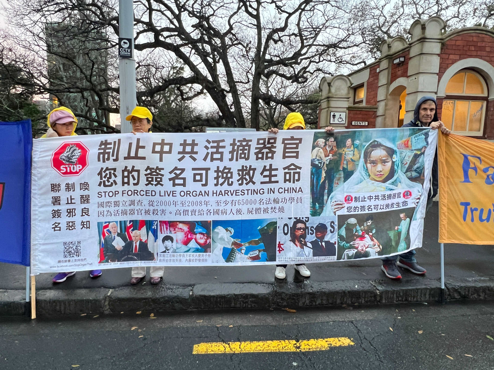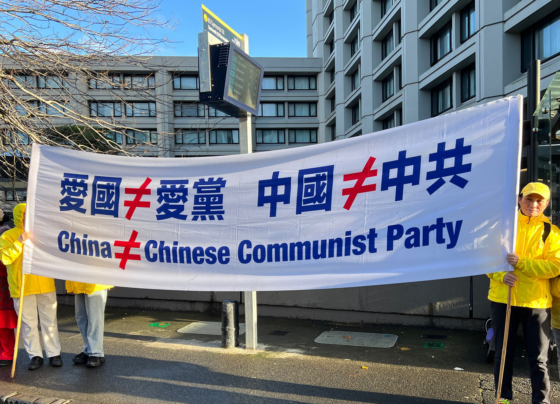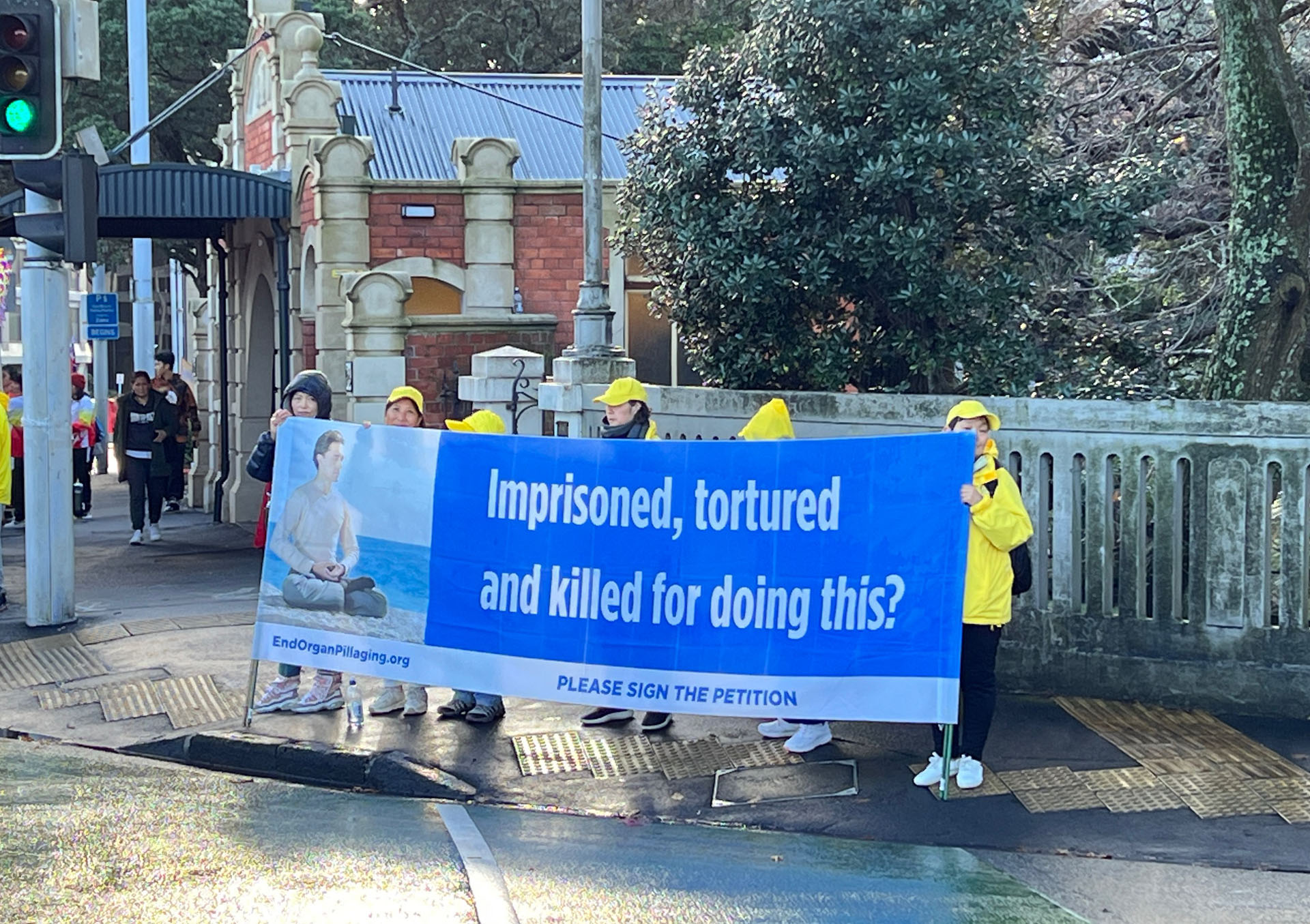 Novi Zeland se nalazi na južnoj hemisferi i usred je zime. Tijekom događaja bilo je hladno, vjetrovito i kišovito vrijeme. Praktikanti su mirno prosvjedovali na vjetru i kiši. Kinesko veleposlanstvo i konzulat angažirali su lokalne pro-KPK Kineze, koji su stigli u nekoliko unajmljenih autobusa i pokušali blokirati transparente praktikanata s kineskim zastavama. Neki od tih ljudi gurali su praktikante; drugi su udarali u gongove i bubnjeve blizu praktikanata; neki su grabili bambusove štapove na kojima su bili pričvršćeni transparenti, dok su drugi noževima rezali transparente. Neki od nasilnika su fizički napali praktikante i odvela ih je novozelandska policija.