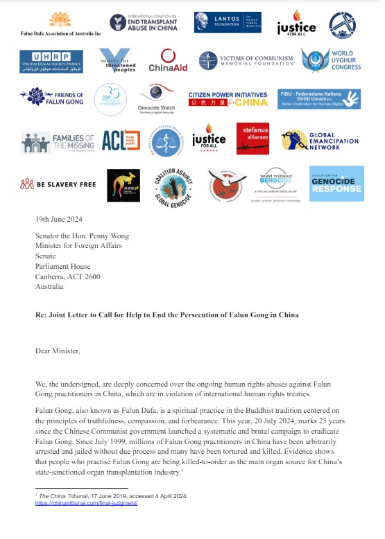 Dvadeset i šest nevladinih organizacija, uključujući Australijsko Falun Dafa udruženje, su zajedno potpisale pismo australskom premijeru i ministru vanjskih poslova prije 20. jula 2024., kada se obilježava 25. godišnjice progona ove prakse od strane Komunističke partije Kine (KPK). Pozvali su australsku vladu da preduzme mjere kako bi pomogla u zaustavljanju nasilnog kršenja ljudskih prava Falun Dafa praktikanata (također poznatog i kao Falun Gong) od strane KPK, te da uvede sankcije protiv počinitelja.