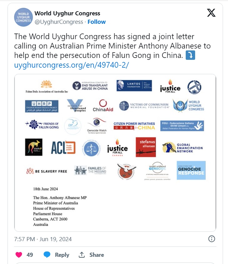 Svjetski ujgurski kongres je, 19. juna, objavio zajedničko pismo na svojoj službenoj web stranici. U njemu se navodi: „Mi, dolje potpisani, duboko smo zabrinuti zbog aktuelnog kršenja ljudskih prava praktikanata Falun Gonga u Kini, što je u suprotnosti sa međunarodnim konvencijama o ljudskim pravima.” i "Pozivamo australsku vladu da odmah preduzme mjere za rješavanje ovih neviđenih kršenja ljudskih prava."