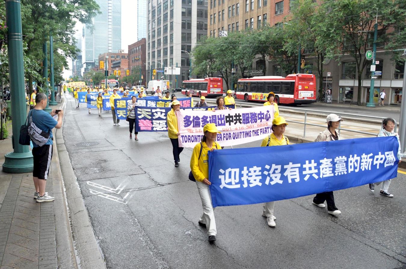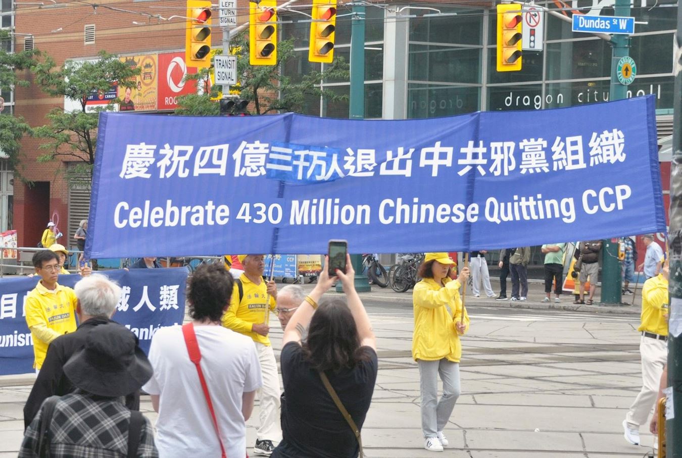 Falun Gong praktikanti su, 29. juna 2024., održali paradu i razne druge aktivnosti u kineskoj četvrti u centru Toronta kako bi odali priznanje za 430 miliona ljudi koji su povukli svoje članstvo u Komunističkoj partije Kine (KPK) i njenim pridruženim organizacijama. Istovremeno su pozvali KPK da okonča 25-godišnji brutalni progon Falun Gonga u Kini.