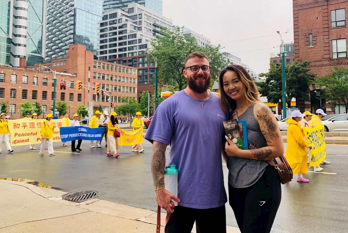 Parada je privukla pažnju Myrona i Joanne. Praktikant im je dao letak i objasnio im svrhu parade. Joanna je kazala: „Objašnjenje praktikanta mi je pomoglo da shvatim šta je Falun Dafa i da saznam za zločine koje je KPK počinila kroz svoju istoriju. Drago mi je što sam saznala za vaše napore da održite pravdu.” Myron je dodao: „U današnjem društvu često se događaju stvari koje preokreću crno u bijelo, a ipak vi ste ustali da ljudima govorite istinu i podržavate pravdu. Ovo otvara oči.”