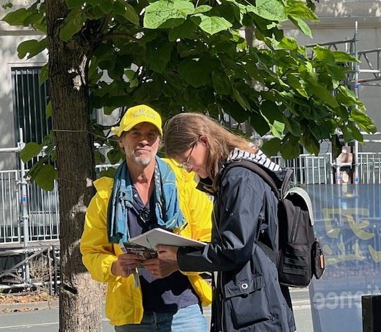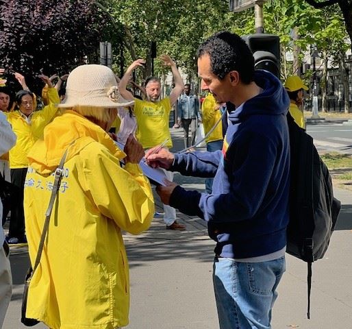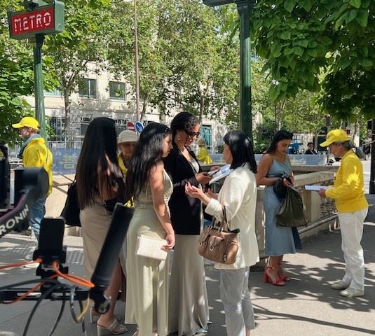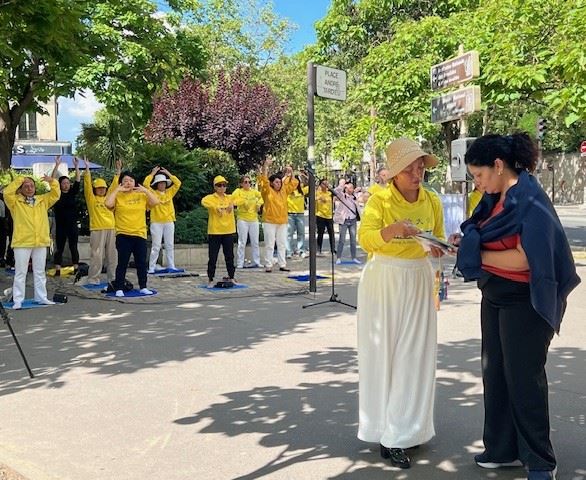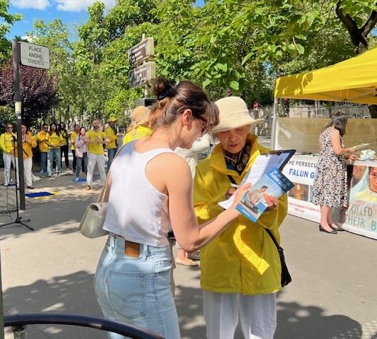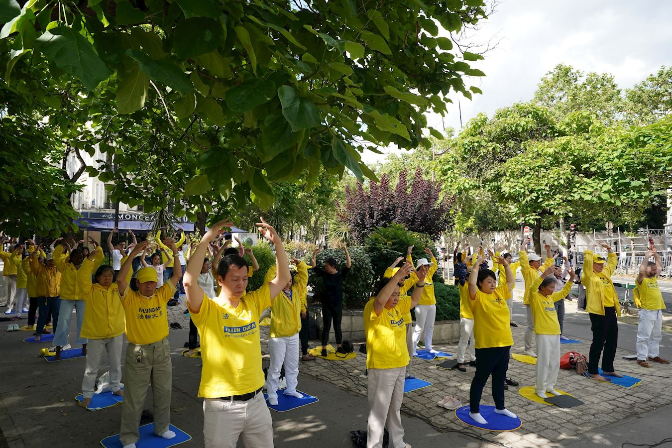 Da bi obilježili 25. godišnjicu progona, Falun Gong praktikanti su, 13. jula 2024., održali skup u blizini kineske ambasade u Parizu. Oni su demonstrirali izvođenje pet vježbi i predstavili principe Istinitost, Dobrodušnost i Tolerancija. Oni su također razotkrili zločine žetve organa počinjene od strane Komunističke partije Kine (KPK), što je navelo mnoge ljude da potpišu peticiju kojom se poziva na okončanje zločina.