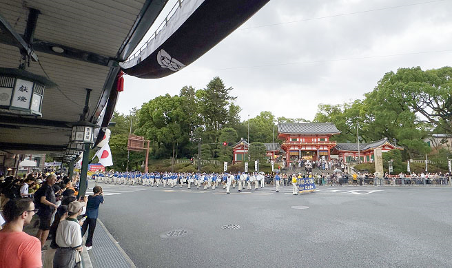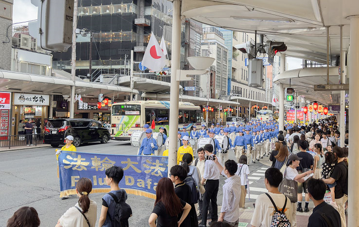 Predvođen orkestrom Tian Guo Marching Band, marš u Kjotu počeo je u 15 časova, 15. jula. Polazna tačka je bila kod mosta Oike Ohashi i prošla je pored svetilišta Iasaka, Maruiama parka, Giona i glavnih ulica u okolini. Mnogi ljudi su pročitali informacije na banerima, a neki su rekli da im se dopadaju principi Istinitosti-Bagosti-Trpeljivosti.