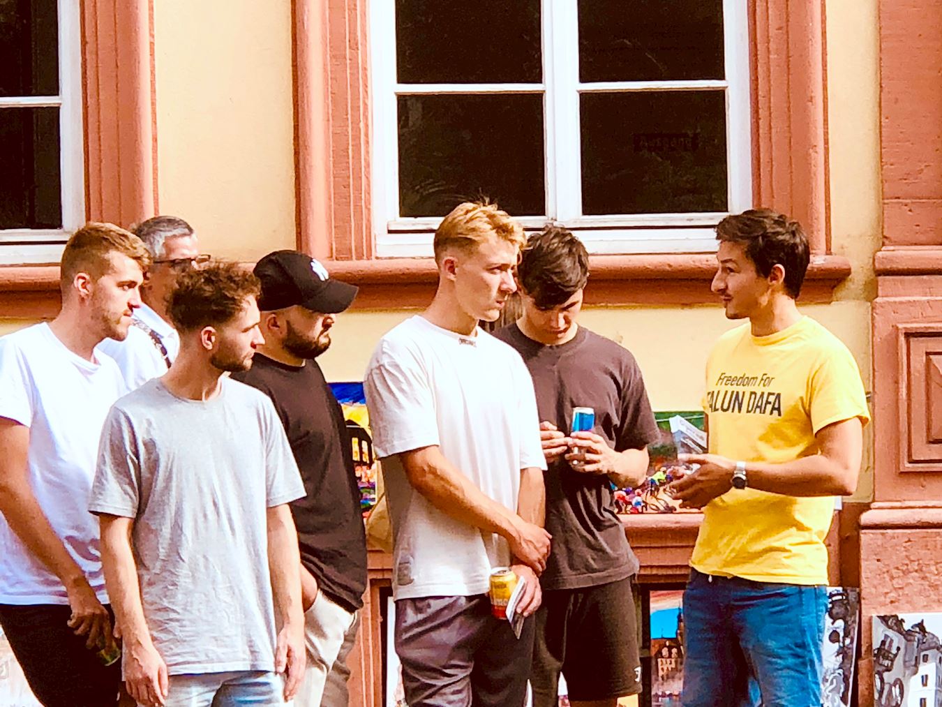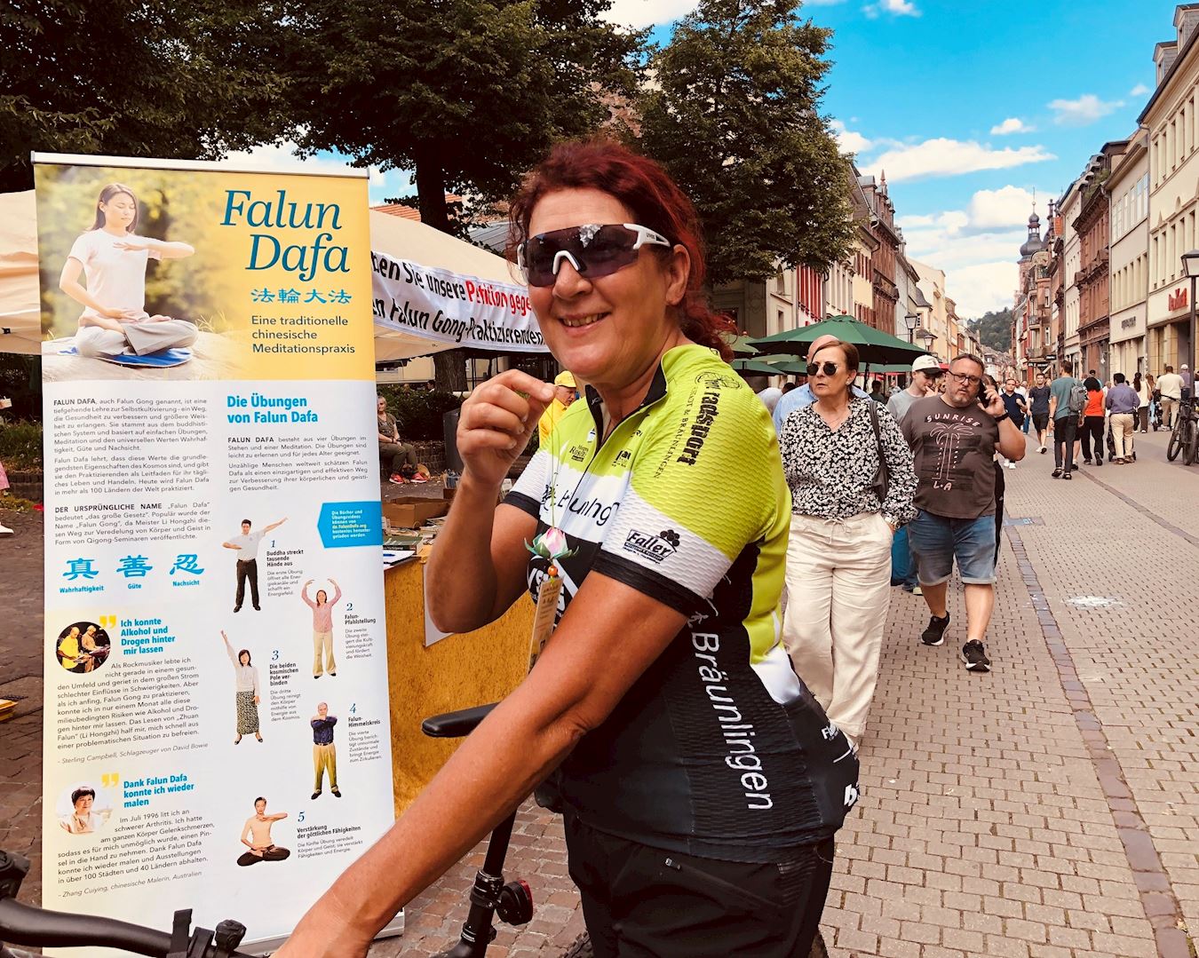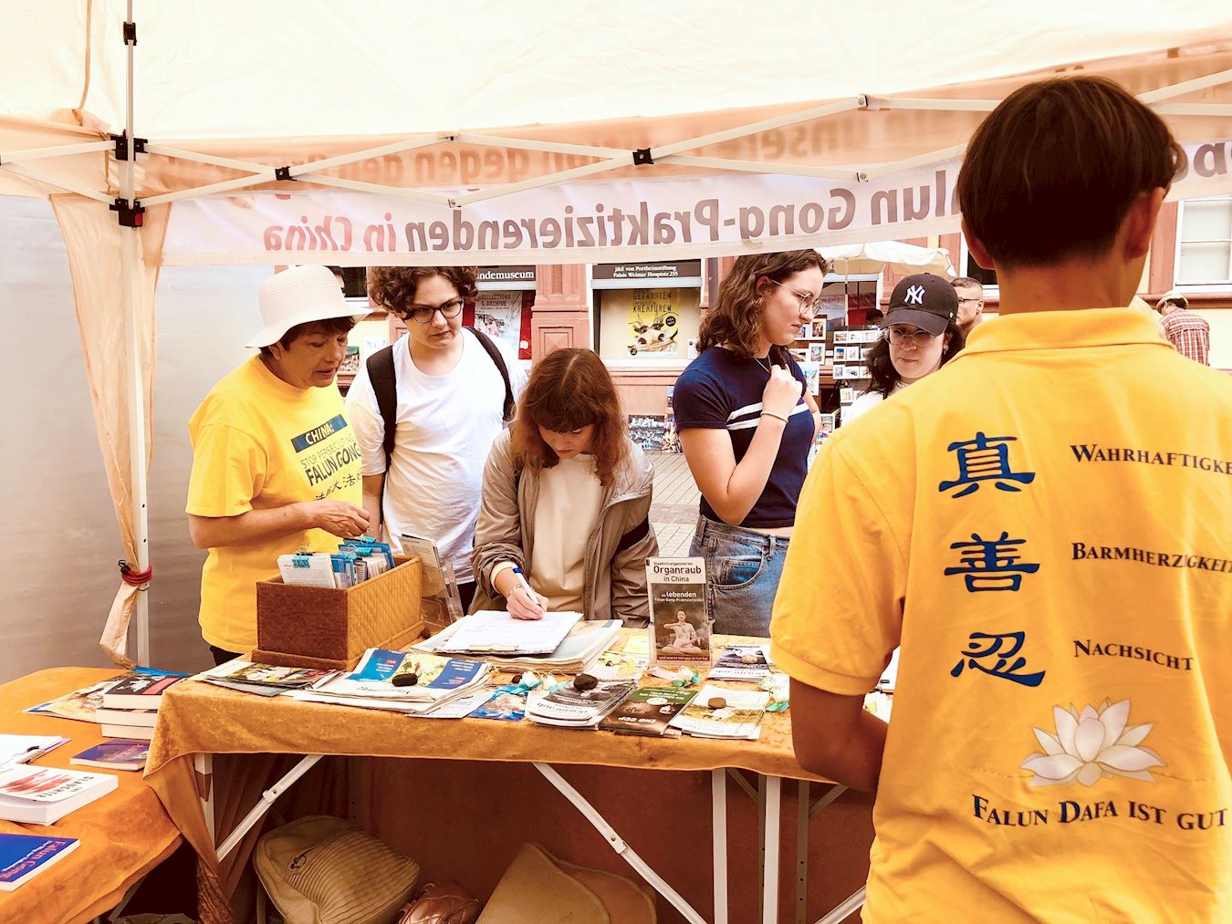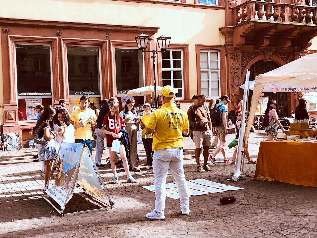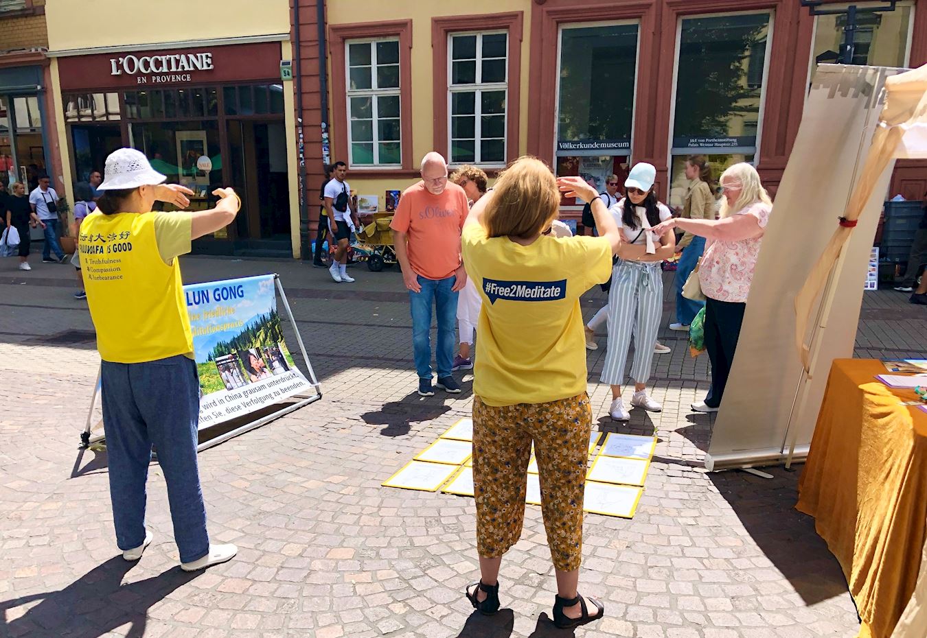 Kako bi obilježili 25. godišnjicu napora praktikanata Falun Gonga da okončaju progon u Kini, praktikanti iz njemačke metropolitanske regije Rhine-Neckar održali su aktivnosti za podizanje svijesti na popularnoj ulici Hauptstrasse u Heidelbergu 13. srpnja 2024. Oni su demonstrirali vježbe, prikupljali potpise, dijelili informacije o Falun Gongu i pozivali na prekid progona od strane Komunističke partije Kine (KPK).
