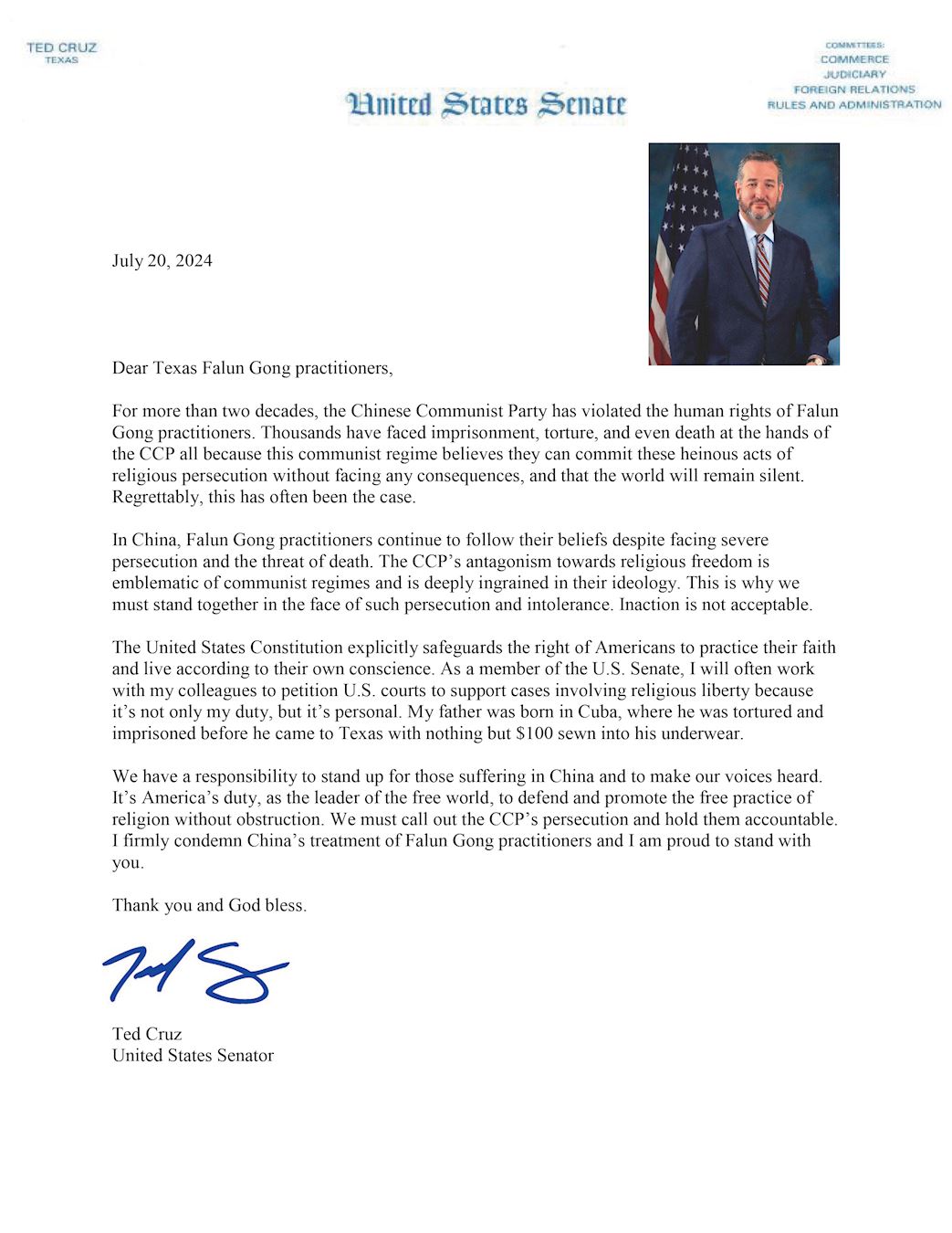 Senator Ted Cruz napisao je u svom pismu potpore: “Imamo odgovornost zauzeti se za one koji pate u Kini i učiniti da se čuje naš glas. Dužnost je Amerike, kao vođe slobodnog svijeta, braniti i promicati slobodno ispovijedanje vjere bez ometanja. Moramo prozvati progon KPK i pozvati ih na odgovornost. Čvrsto osuđujem kinesko postupanje s praktikantima Falun Gonga i ponosan sam što stojim uz vas.”