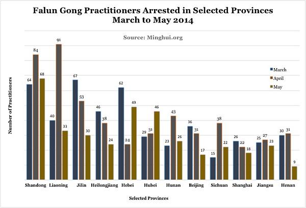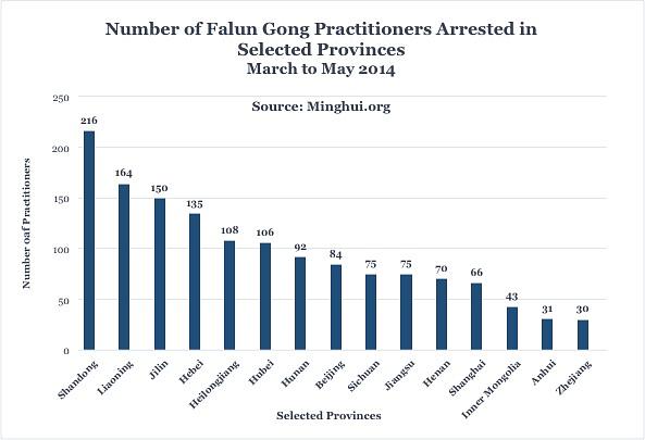 S izuzetkom Tibeta, takvi slučajevi su zabilježeni u svim provincijama, izdvojenim gradovima te autonomnim pokrajinama u Kini. Broj uhićenih Falun Gong praktikanata naglo je porastao od ožujka ove godine. Prema informacijama dobivenim do 3. lipnja, 1694 praktikanata je uhićeno od ožujka do svibnja 2014., što predstavlja povećanje od 30% u odnosu na isto razdoblje prošle godine.