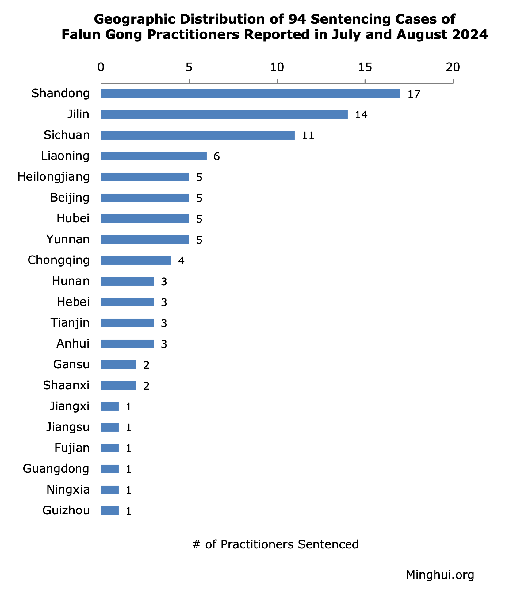 Osuđeni praktikanti potiču iz 18 provincija i 3 opštine pod centralnom kontrolom. Shandong, Jilin i Sichuan su na vrhu liste sa 17, 14, odnosno 11 slučajeva. Preostalih 18 regija je imalo jednocifrene slučajeve između 1 i 6.