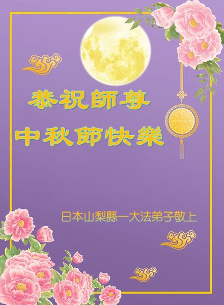 Čestitke iz Tokija, Japan.Praktikanti u Indoneziji žele Učitelju Li-u sretan Praznik sredine jeseni!Čestitke od Falun Dafa praktikanata iz Filipina. Čestitke su poslali praktikanti u novozelandskom timu bubnjara.Praktikanti iz južne Floride žele Učitelju Li-u sretan Praznik sredine jeseni.Praktikanti iz Rumunjske također su poslali svoje čestitke.Čestitke od praktikanata u Globalnom servisnom centru za napuštanje KPK.Još jedna čestitka od praktikanata iz Rumunjske.Praktikanti iz Južne Koreje poslali su svoje čestitke. Praktikanti u Poljskoj poželjeli su Učitelju Li-u sretan Praznik sredine jeseni!