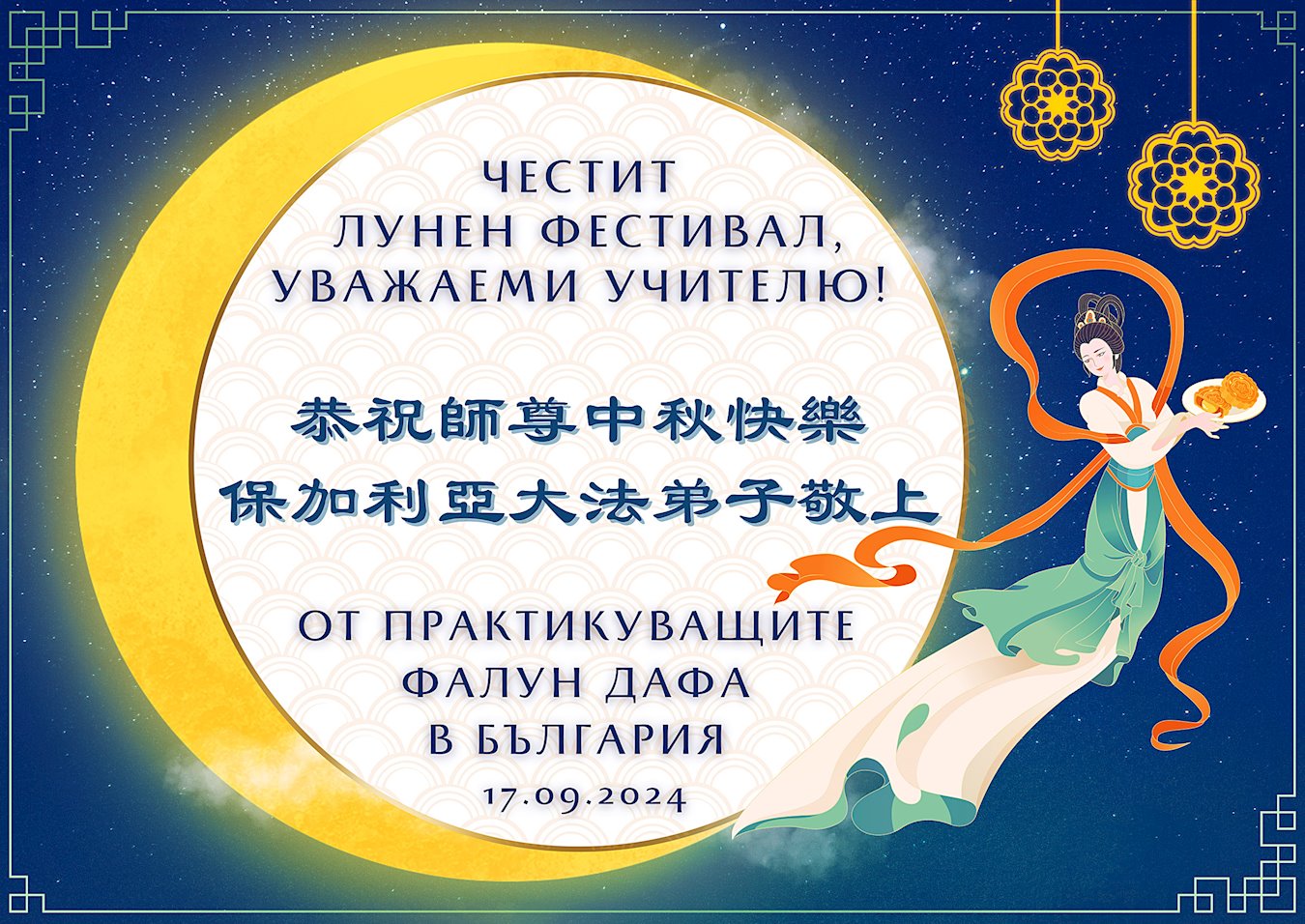 Praznik sredine jeseni 2024. (poznat i kao Mjesečev praznik) bio je 17. rujna. Minghui je primio čestitke od praktikanata diljem svijeta, koji su zahvalni za Falun Dafa i žele g. Li Hongzhi-u, osnivaču prakse, sretan praznik. Ovi praktikanti su rekli da su spremni učiniti bolje u skladu s načelima Istinitosti-Dobrodušnosti-Tolerancije i pomoći da se probudi više ljudi.