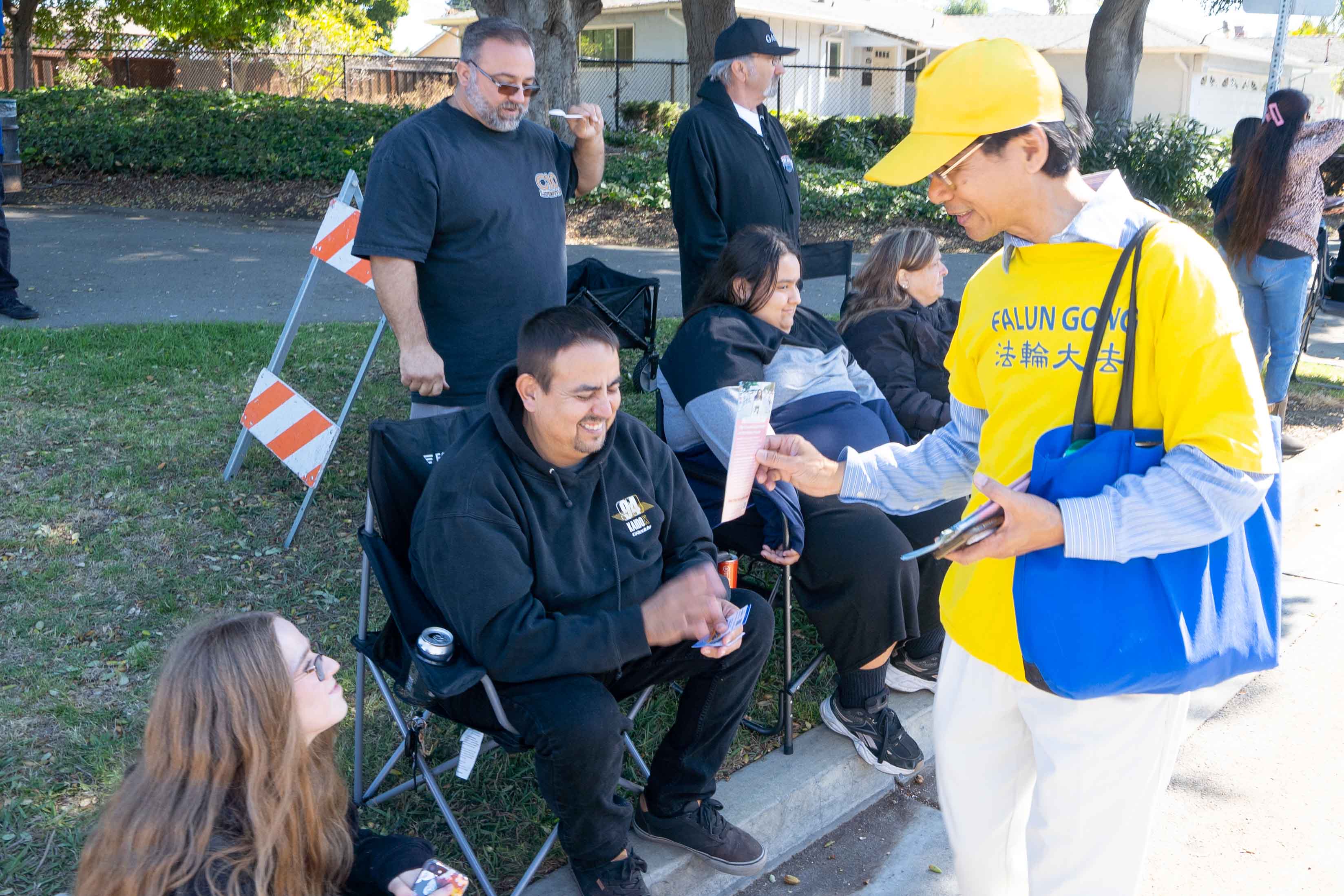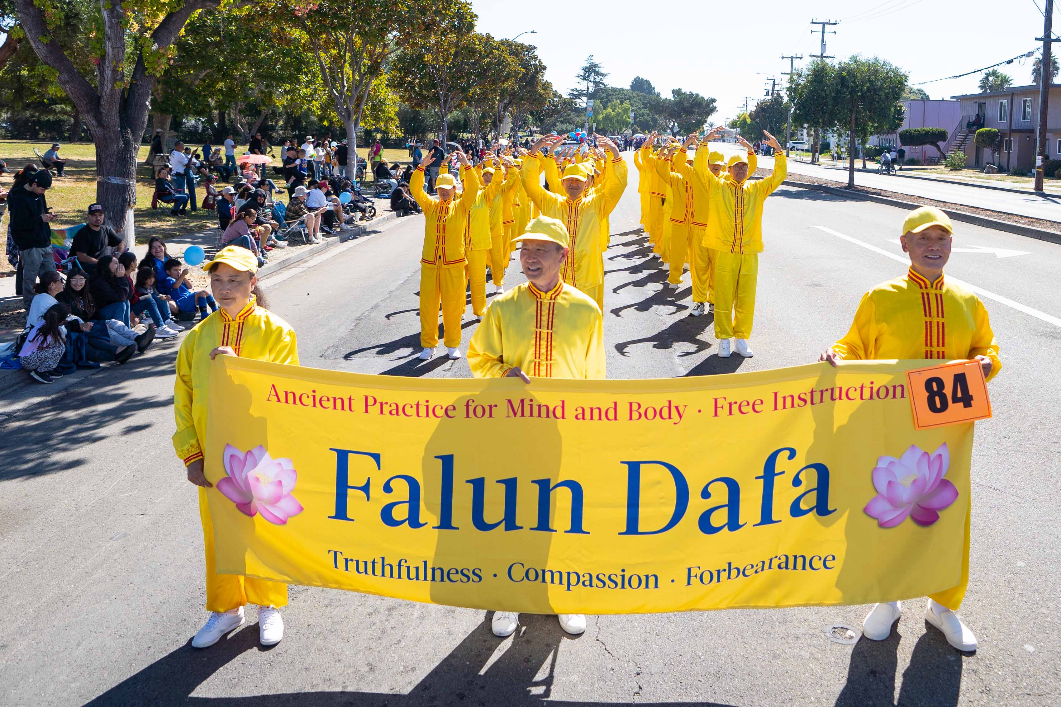 Dok su praktikanti marširali pored sudaca, MC ih je predstavio: “Falun Dafa se temelji na principima Istinitosti, Dobrodušnosti, Tolerancije. Ovo je praksa uma i tijela i podučava se besplatno. Poduke se održavaju u raznim dijelovima područja zaljeva i svi su dobrodošli da se prijave.”