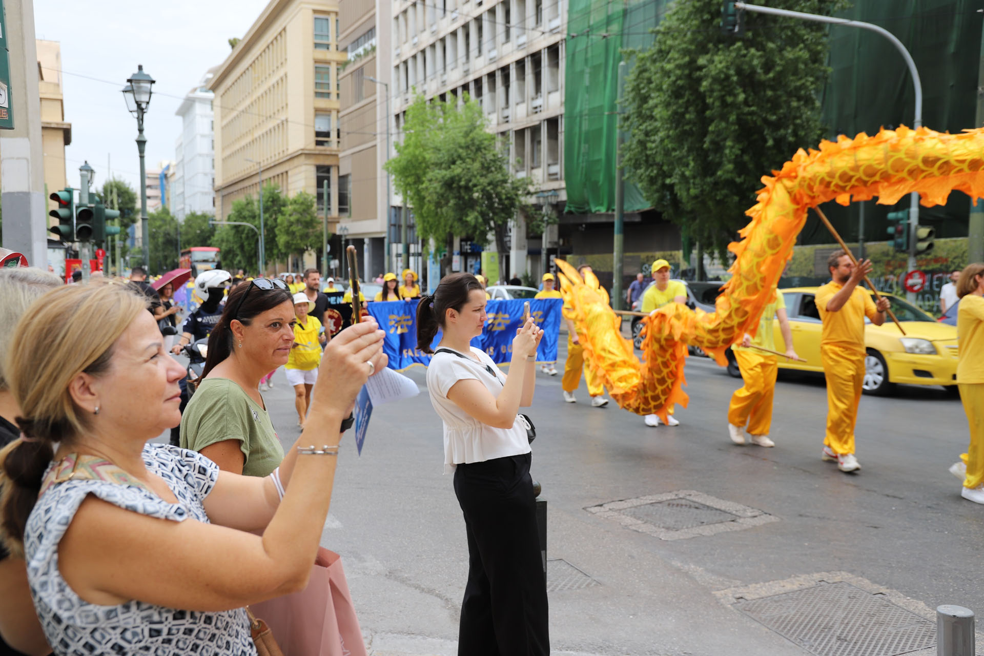 Parada je prolazila i pored turističkih atrakcija i poznatih trgovačkih ulica ispunjenih mještanima i turistima. Mnogi ljudi su fotografisali, aplaudirali, mahali i navijali. Kada se marš nakratko zaustavio na trgu Syntagma i Monastiraki, predstavnik praktikanata je upoznao posmatrače sa Falun Gongom i kazao im za progon koji vrši KPK.