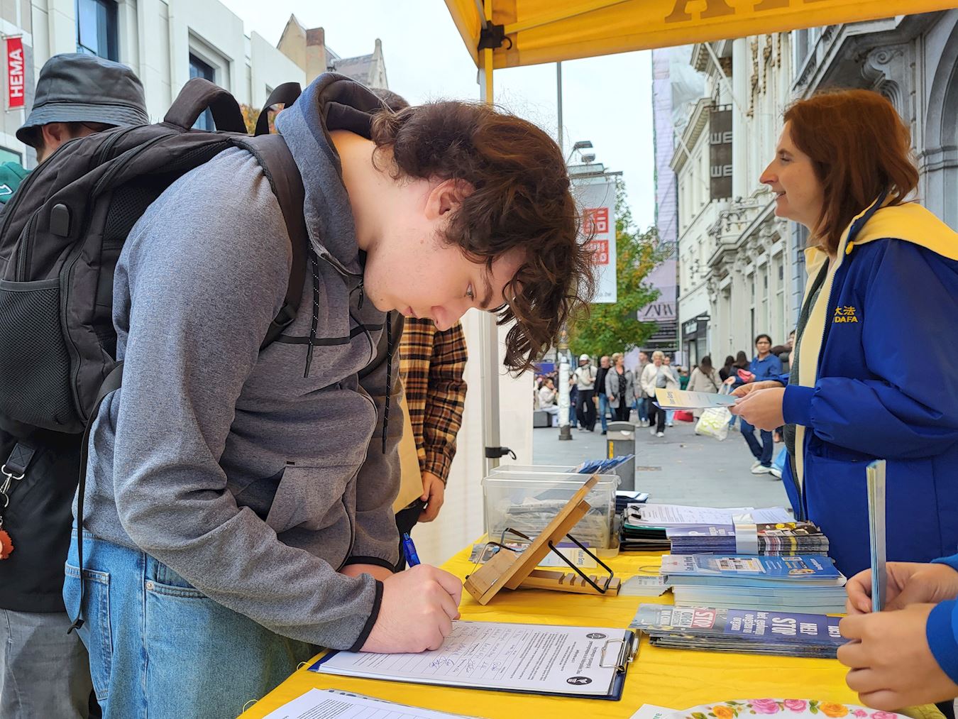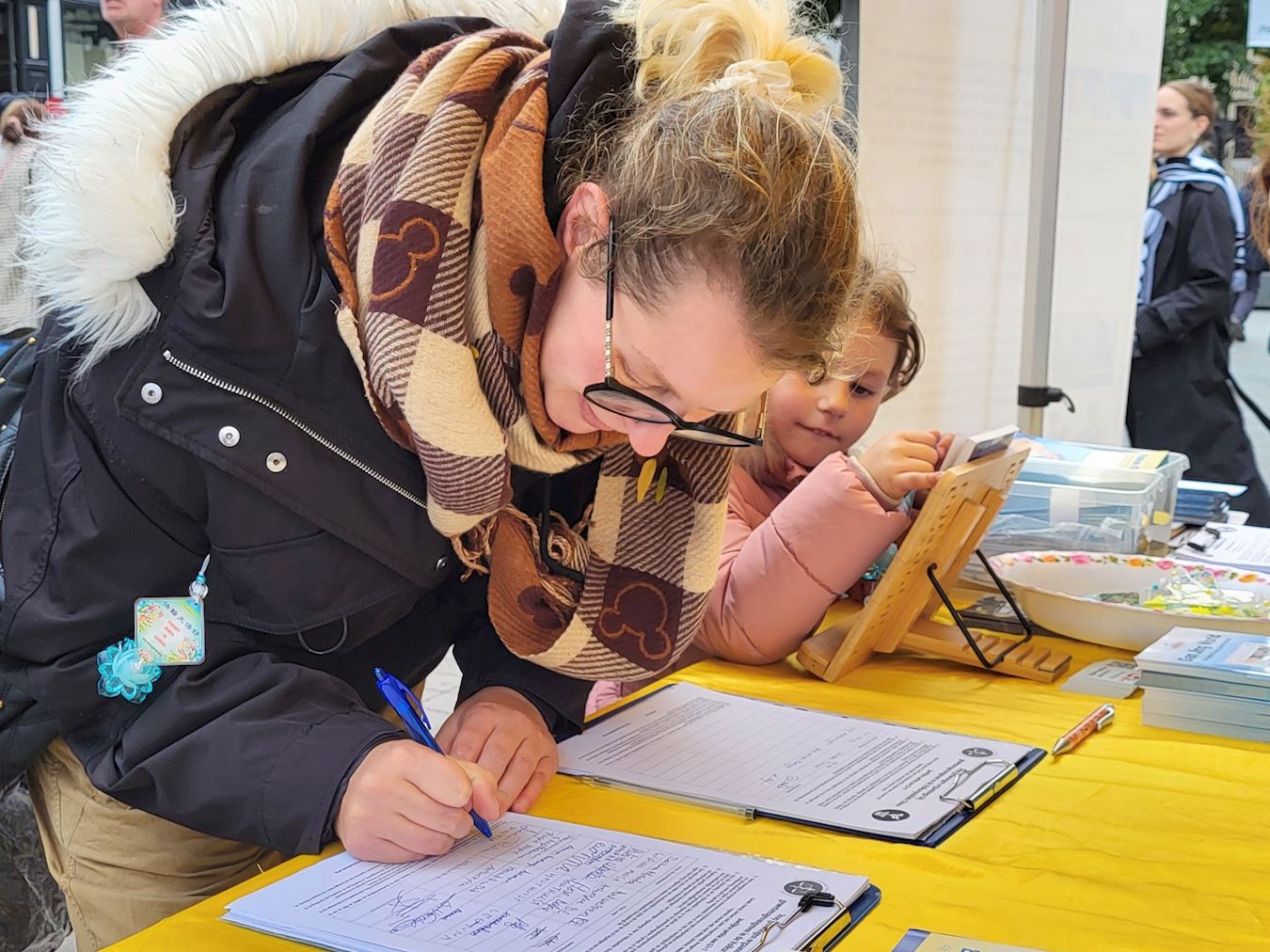 Stefani, njen muž i njihovo troje dece su gledali kako praktikanti rade vežbe. Posetili su štand da saznaju više. Stefani je rekla da joj tradicionalne vrednosti odgovaraju. Kada je saznala za progon, rekla je: „Vlast to ne bi trebalo da radi. Ljudi treba da imaju pravo da biraju svoja uverenja. Meditacija i kultivacija su prave stvari koje treba raditi.” Oni su odmah potpisali peticiju protiv prinudnog uzimanja organa u Kini.