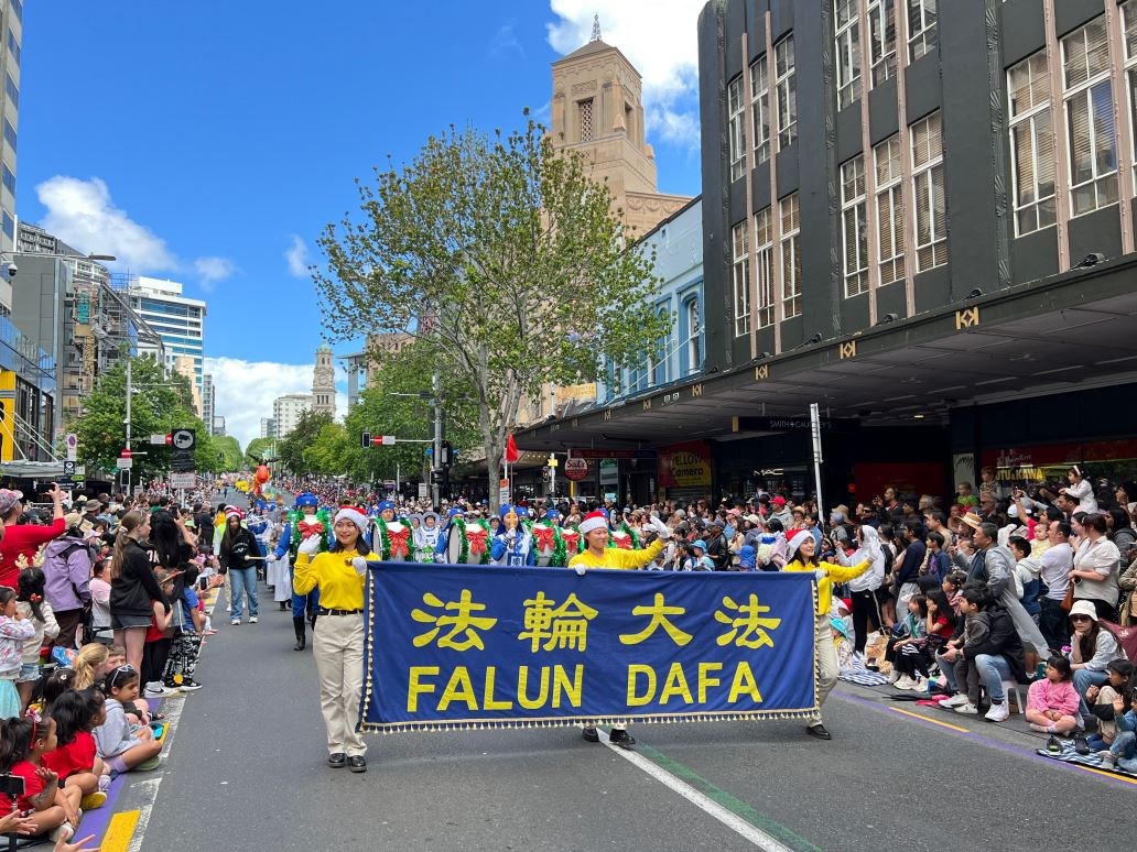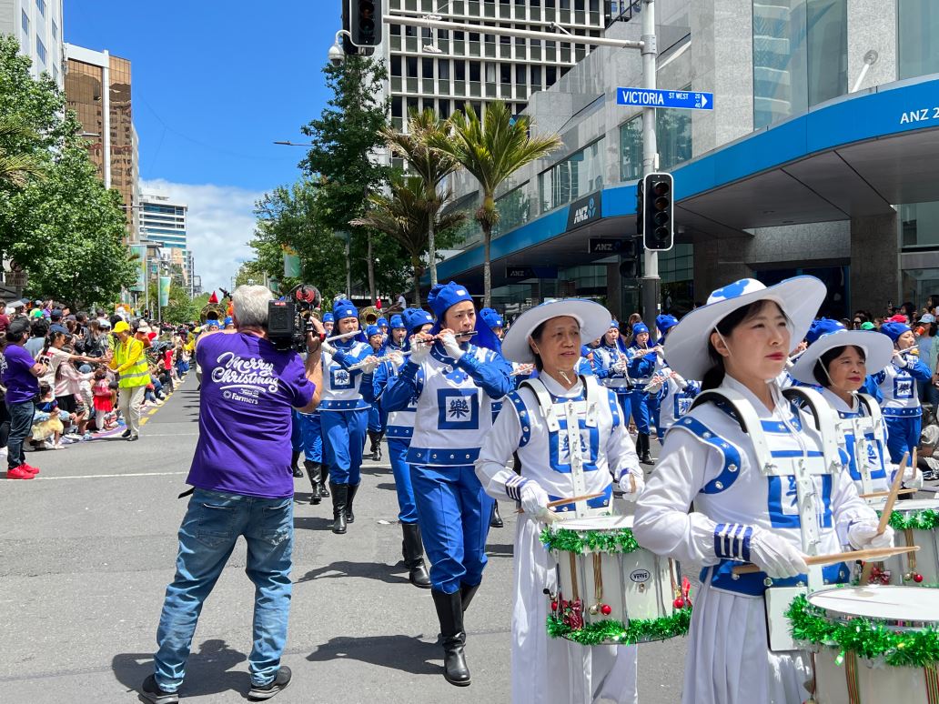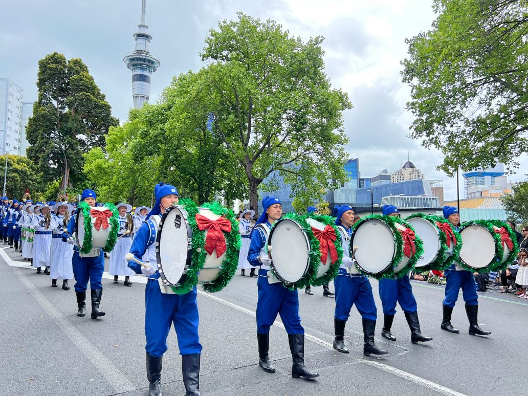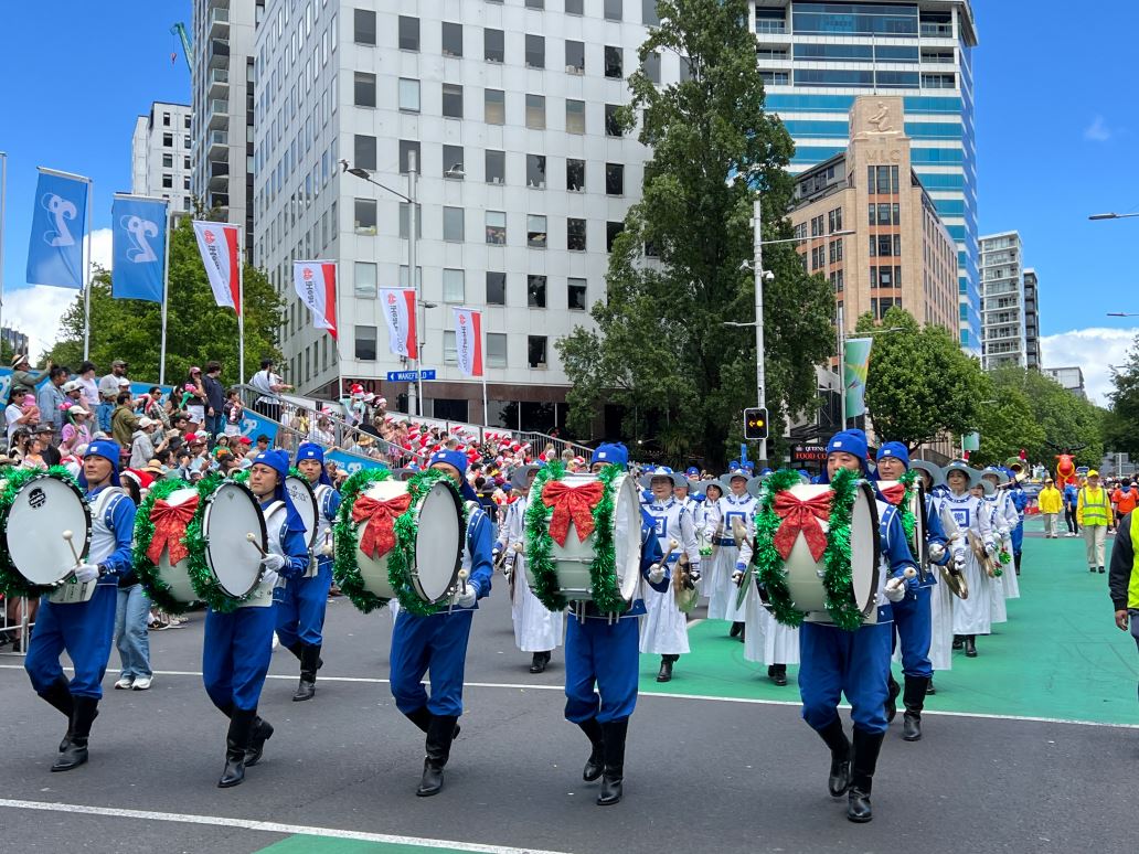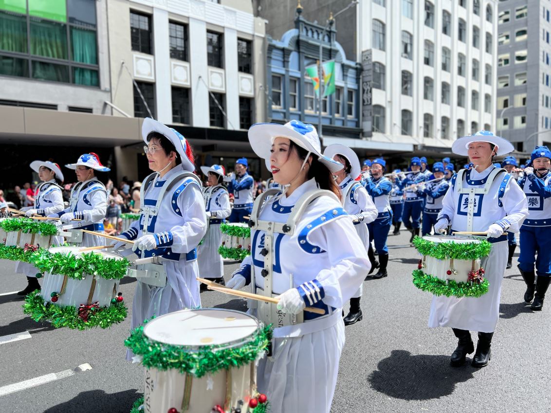 Na Novom Zelandu, Tian Guo Marching Band Falun Dafa praktikanata, plesači zmajeva i tim bubnjara sudjelovali su u četiri božićne parade 23. i 24. studenog 2024. Njihovi su nastupi bili dobro primljeni od strane gledatelja i dobili su pljesak puno puta.