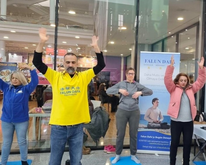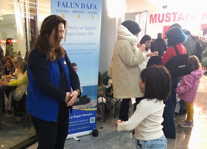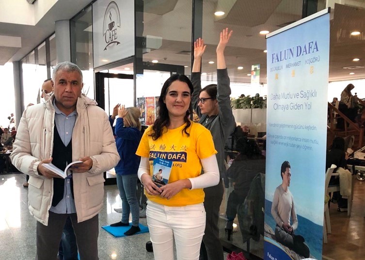 Gđa İlknur, koja je prethodno učila Falun Dafa vježbe na online satu, radila je vježbe s praktikantima na sajmu.