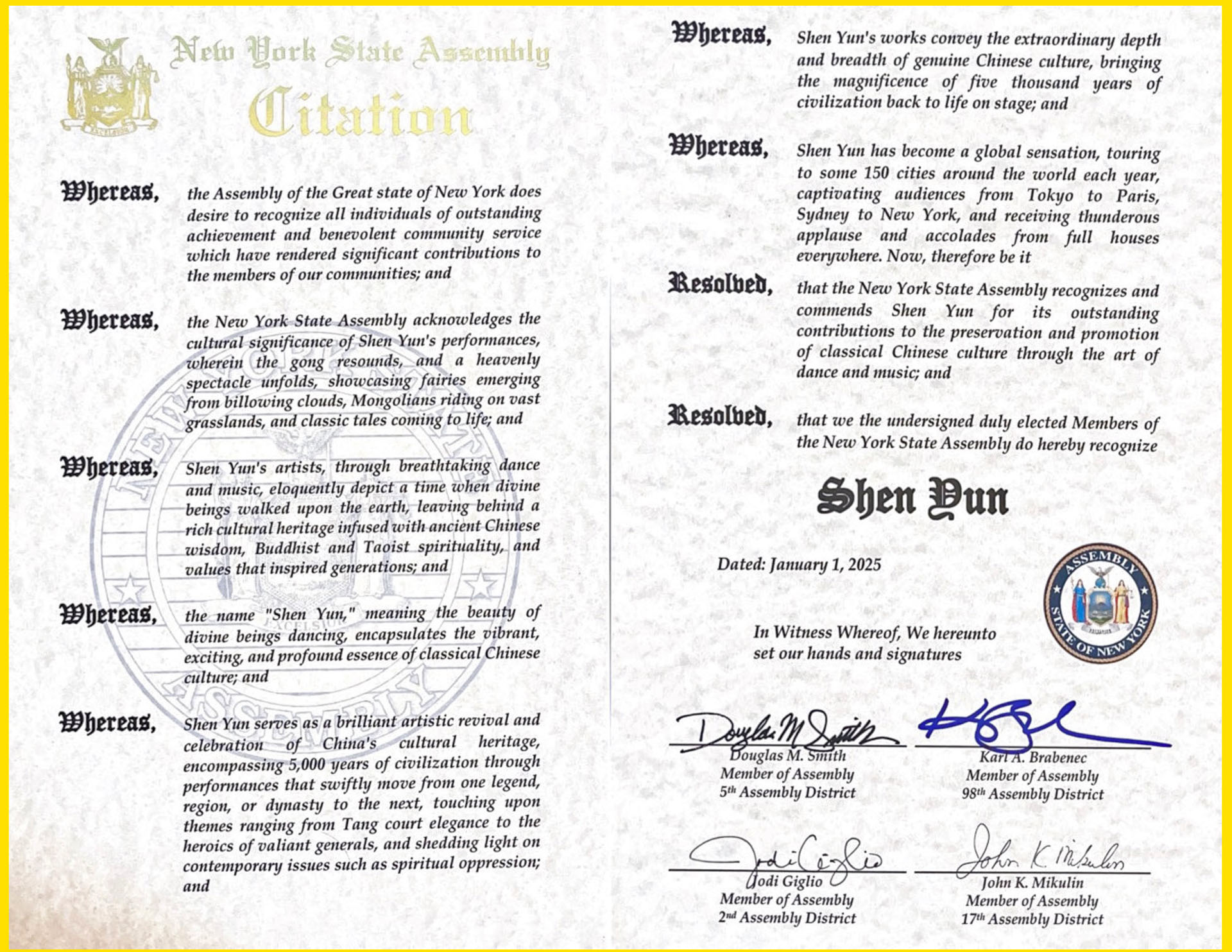 Poslanici skupštine države Njujork pozdravljaju Shen Yun