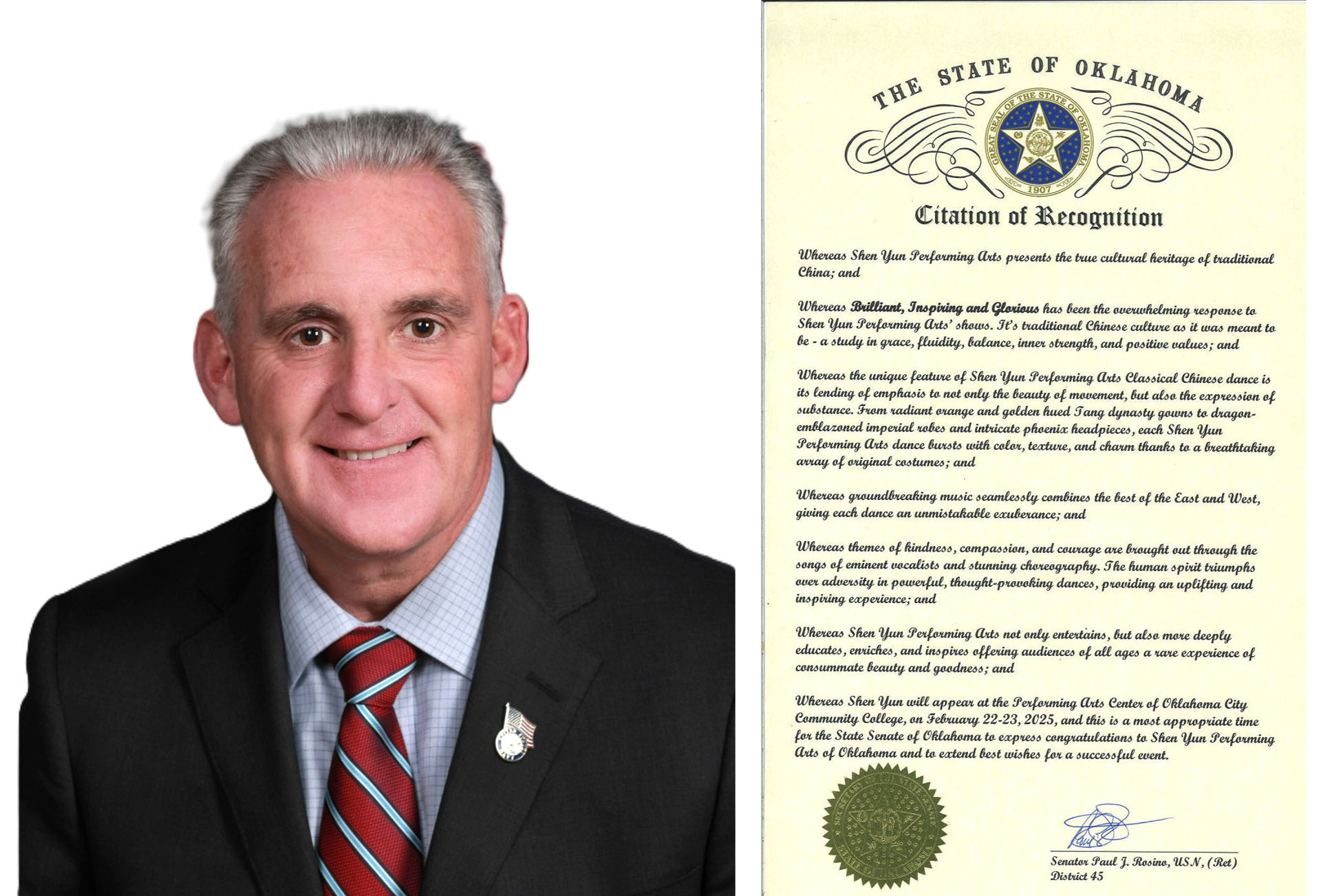 Prije nastupa Shen Yuna u Oklahoma Cityju, Oklahoma, 22. i 23. februara, ova je pozorišna trupa primila Citation of Recognition od senatora države Oklahoma Paula Rosina.