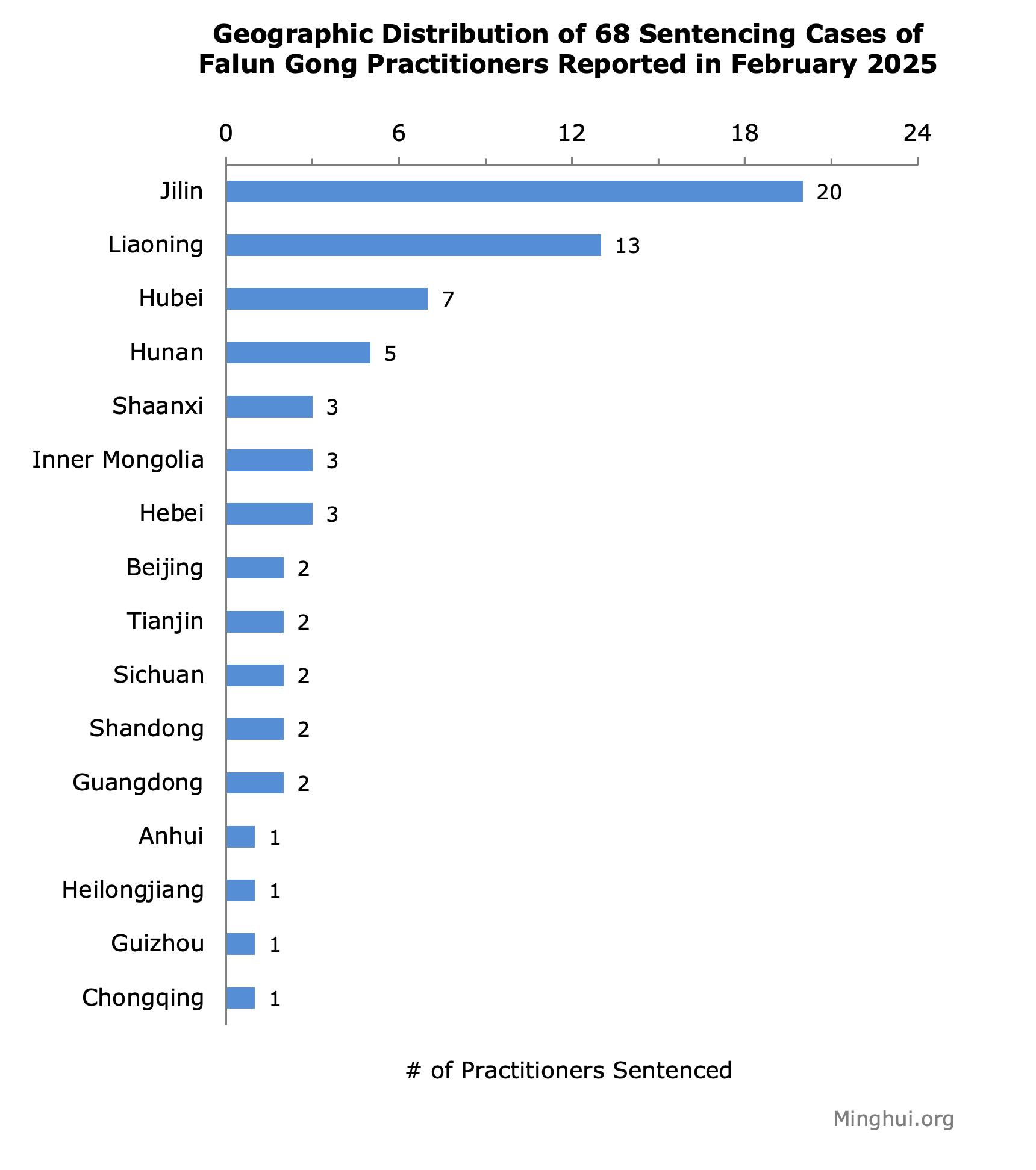 U februaru 2025. godine, Minghui.org je saznalo za 68 slučajeva Falun Gong praktikanata osuđenih na zatvorsku kaznu zbog svoje vjere.