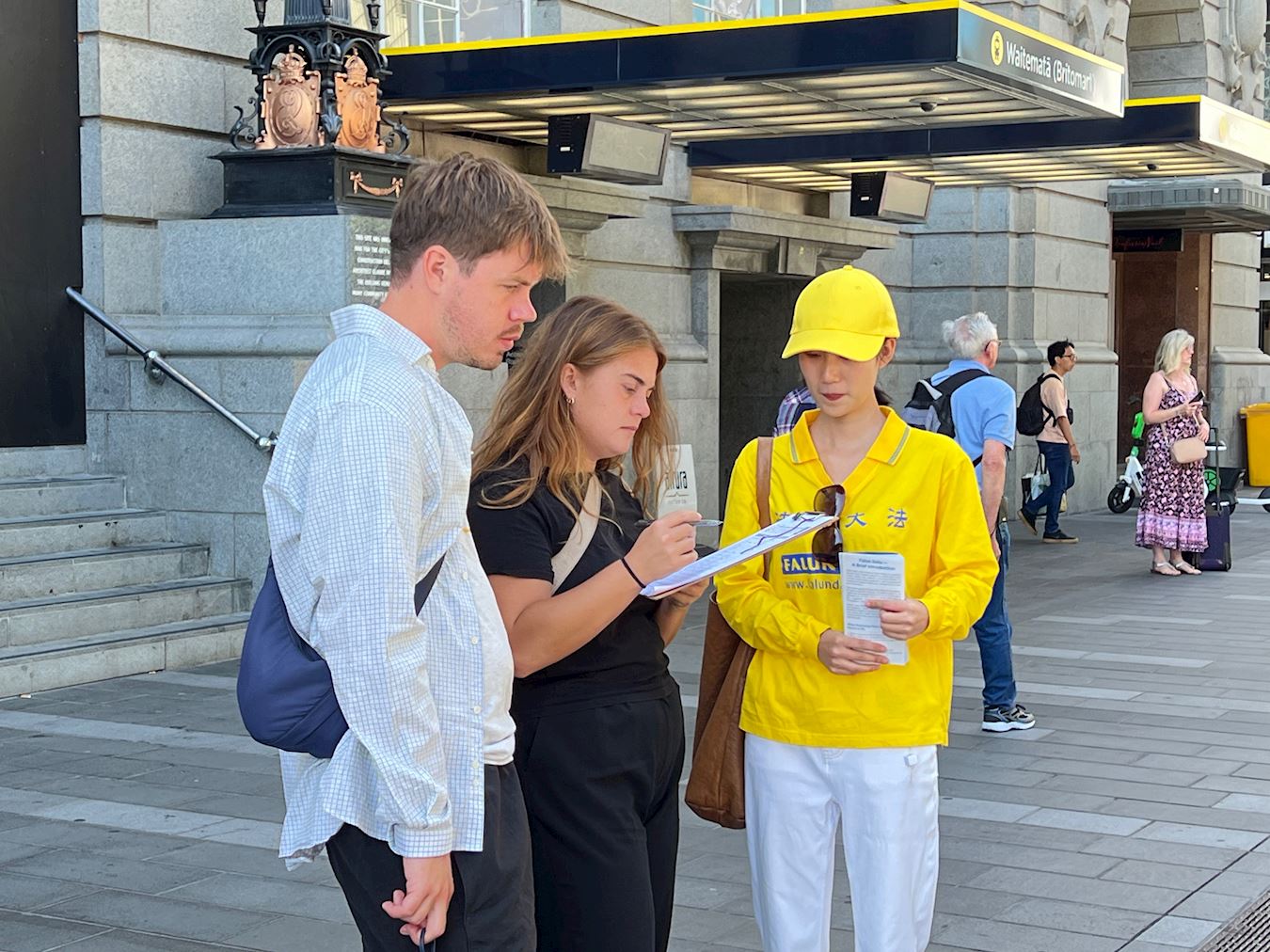 Obučeni u žute majice i bijele pantalone, praktikanti su radili vježbe uz umirujuću muziku. Organizovan i miran prizor je naveo ljude da zastanu i posmatraju. U tom području se neprestano odvija pješački promet, a i ogromni se krstareći brod zaustavio u zaljevu. Turisti iz cijelog svijeta kao i lokalni kupci su se zaustavljali na informativnom štandu. Neki su čitali prikazane informacije dok su drugi fotografisali ili razgovarali sa praktikantima kako bi saznali više o Falun Dafa. Neki ljudi su pak na licu mjesta naučili vježbe.