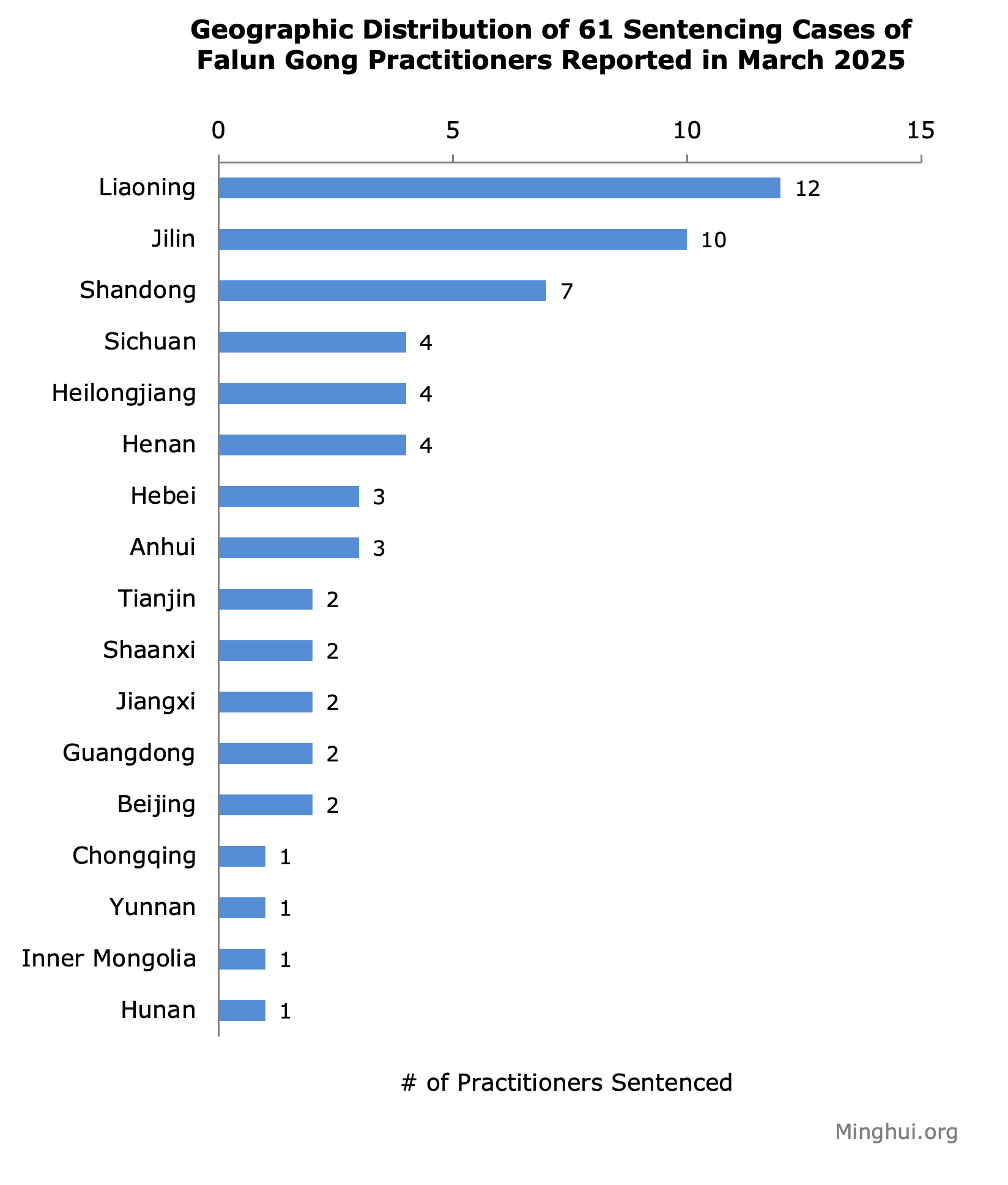 Osuđeni Falun Gong praktikanti su porijeklom iz 17 provincija ili opština pod kontrolom centralnih vlasti. Provincija Liaoning je prijavila najveći broj slučajeva, 12, zatim 10 slučajeva u Jilinu i 7 u Shandongu. Preostalih 14 regija imalo je između 1 i 4 slučaja.
