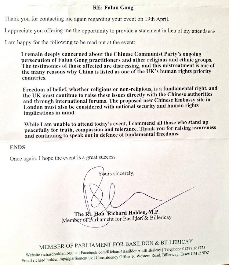 Poslanik Rt. Hon. Ričard Holden je u svom pismu naveo: „I dalje sam duboko zabrinut zbog tekućeg progona praktikanata Falun Gonga i drugih verskih i etničkih grupa od strane Komunističke partije Kine.”