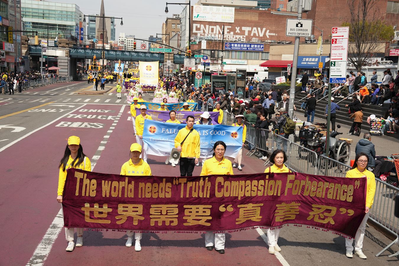 U 12 sati, sa Tian Guo Marching Bandom koji je preuzeo vodstvo, praktikanti su marširali glavnom ulicom, Flushing. Nastup benda je dirnuo gledaoce. Jedna osoba je uzviknula: "Samo jedna riječ, sjajno!" Drugi je rekao: "Falun Dafa je nevjerovatan!" Ostali komentari su bili: “Istinitost, Dobrodušnost i Tolerancija donose nadu!“ i "Ne mogu prestati plakati, toliko su dirljivi, osjećam se ponosno zbog njih. Morate pokazati svijetu progon koji se još uvijek dešava, i mora prestati." “Nada za Kinu leži u Falun Gong-u.”