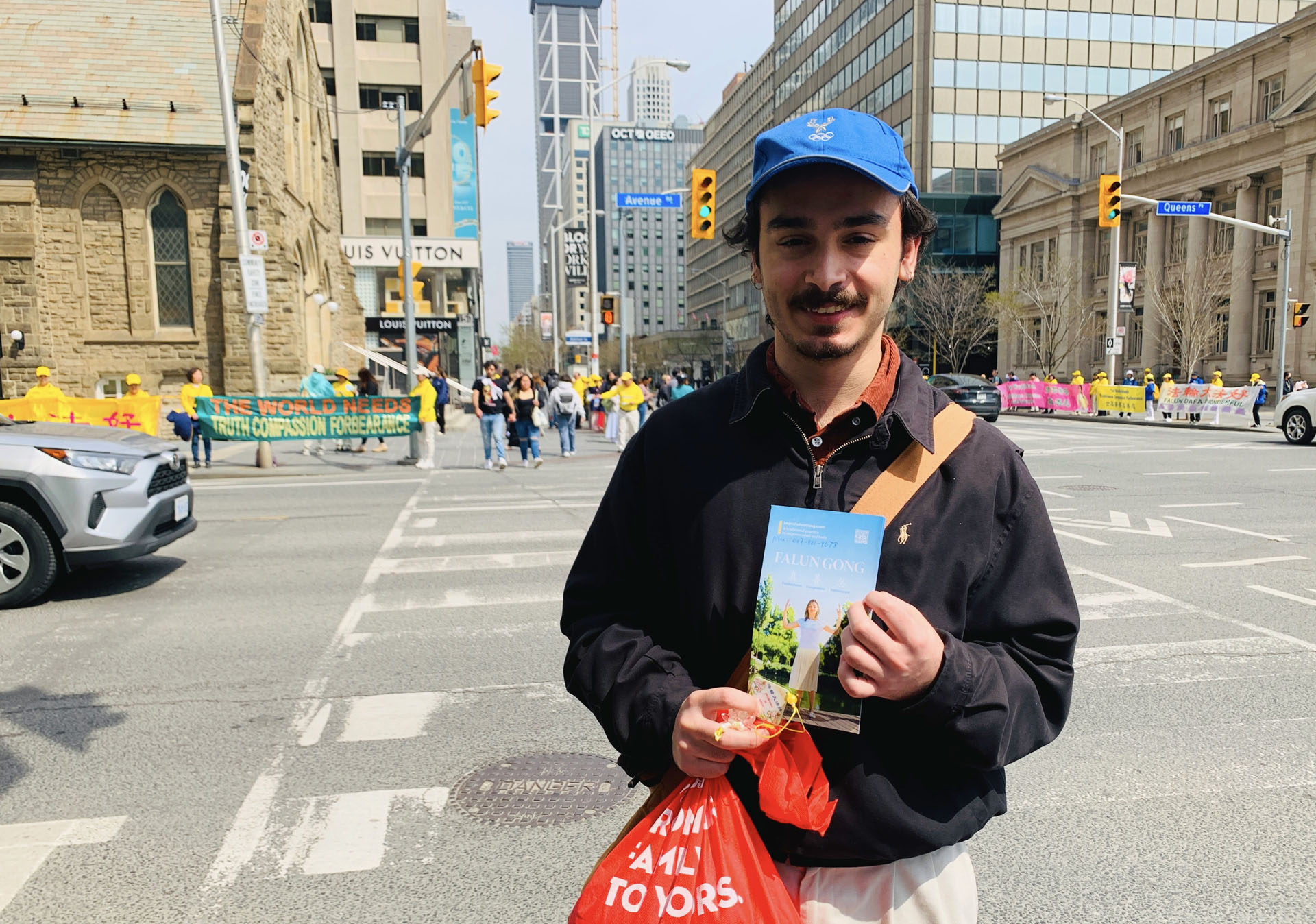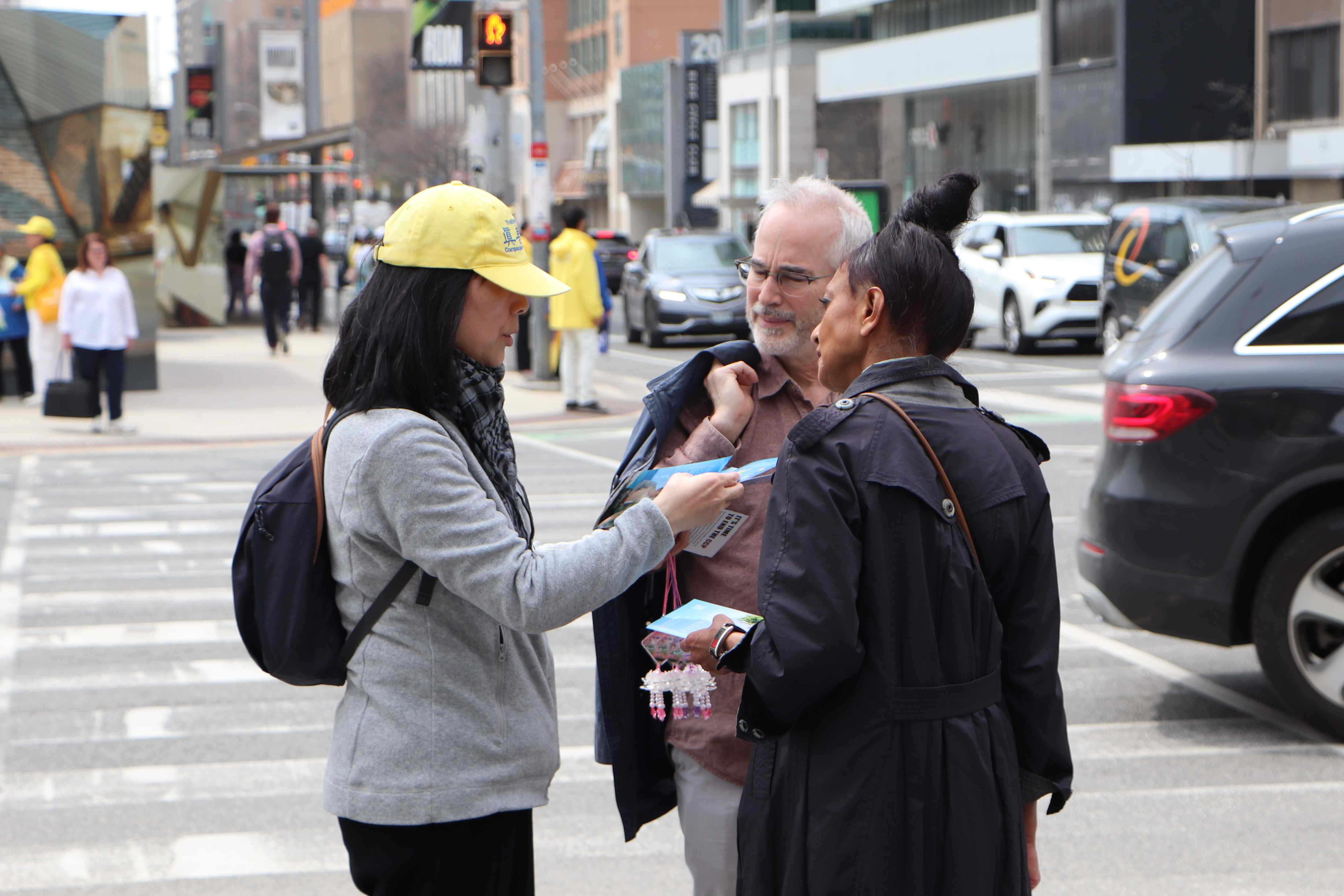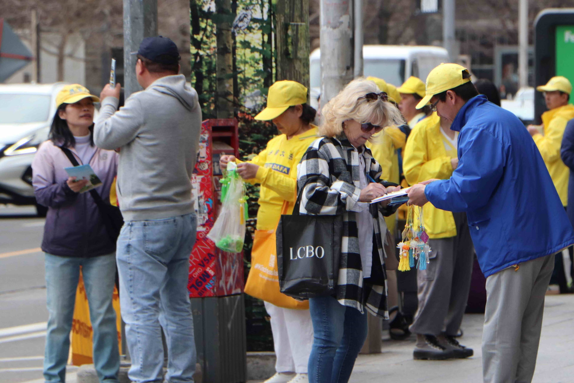 Tog popodneva, na raskrsnici Avenue Road i Bloor Street, postavili su transparente kako bi kod građana podigli svijest o tekućem progonu Falun Gonga u Kini. Prolaznici su potpisivali peticiju u znak podrške naporima praktikanata da okončaju progon i osudili KPK za zločine koje je počinila nad praktikantima. Nakon što su saznali istinu o progonu, nekoliko ljudi iz Kine je odlučilo napustiti KPK i njene pridružene organizacije.