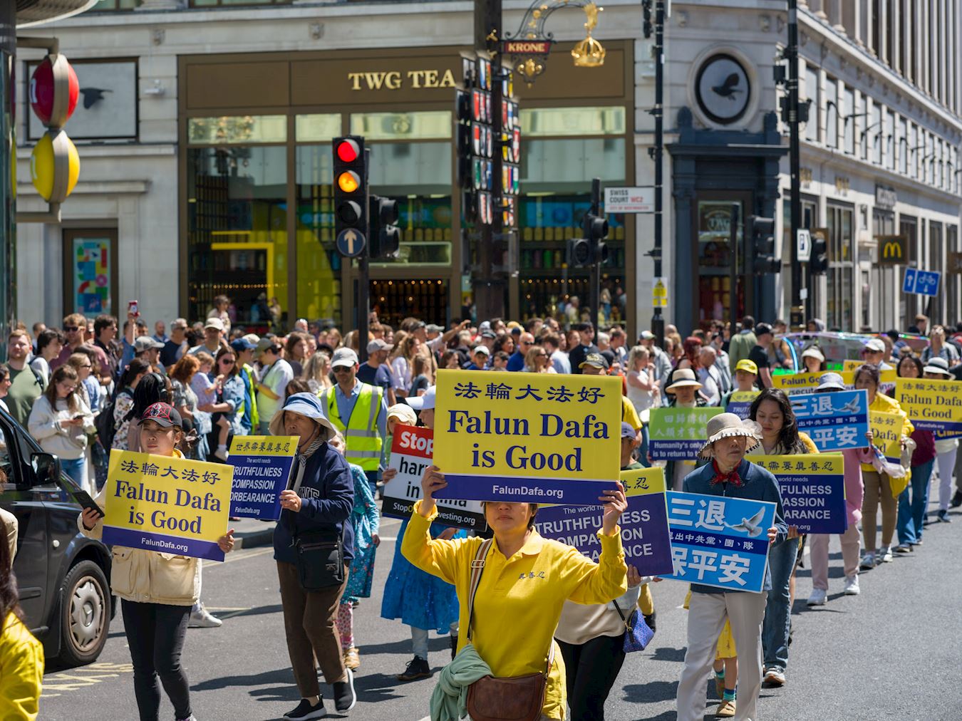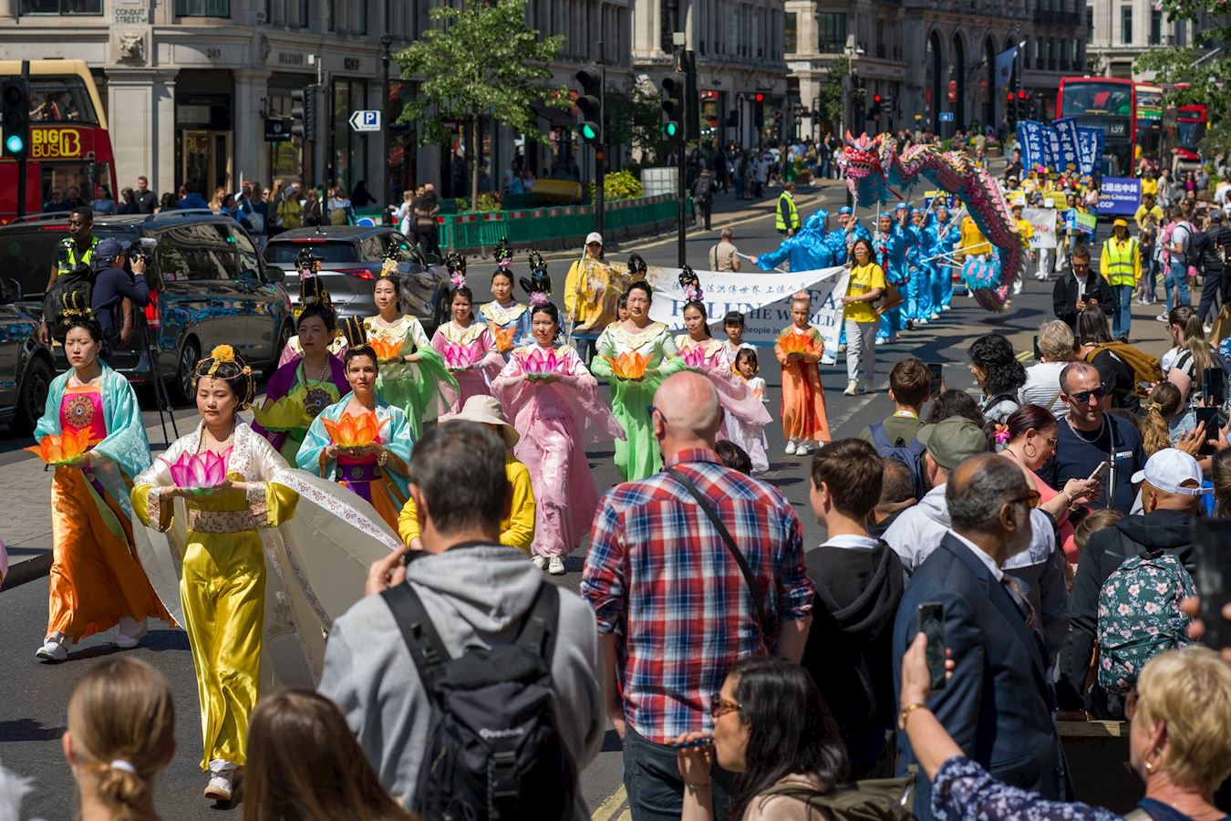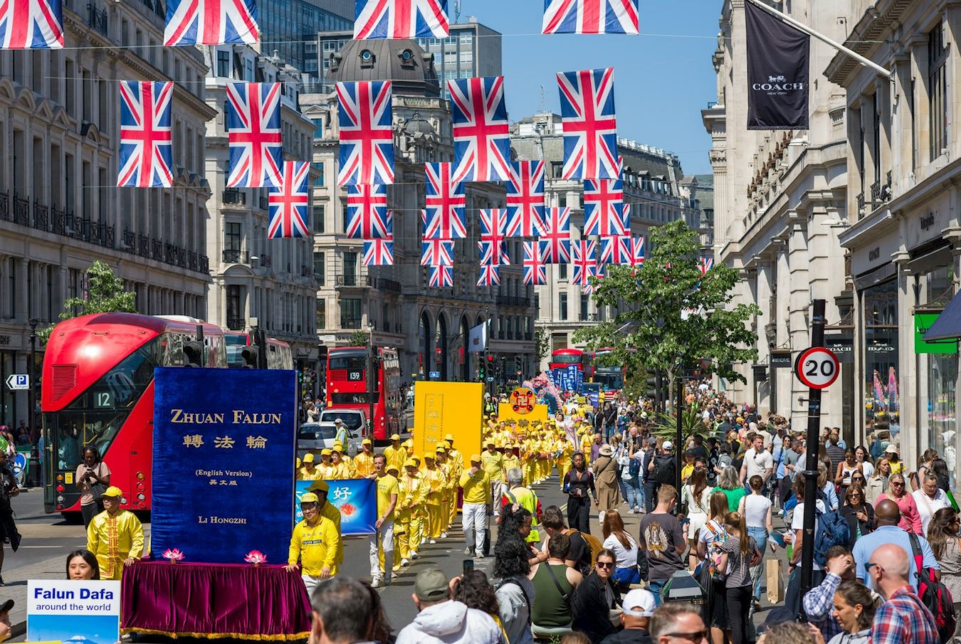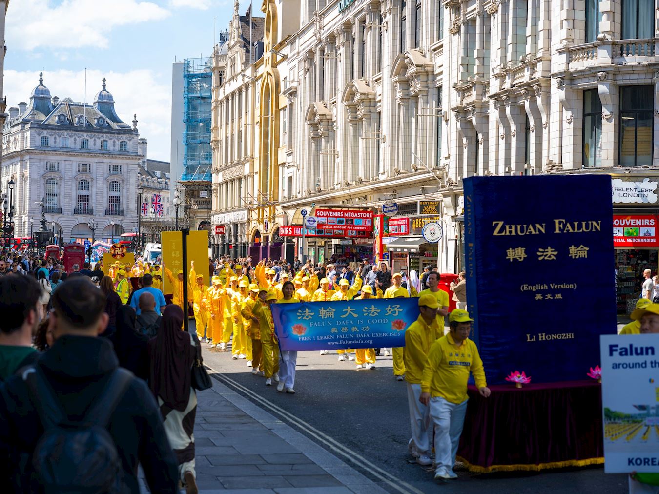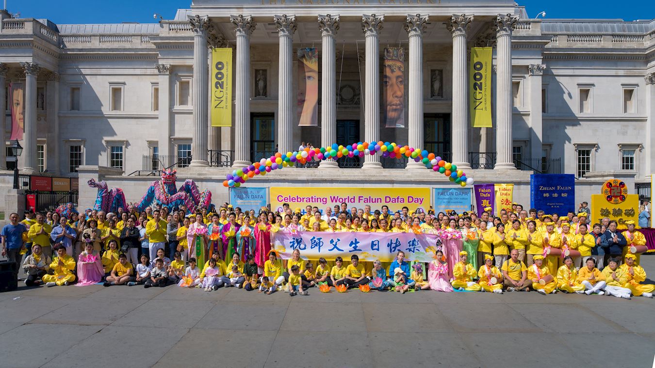 Praktikanti su 10. maja 2025. godine održali veliku paradu i skup u centru Londona kako bi proslavili 26. Svjetski dan Falun Dafa, koji se obilježava 13. maja. Ovaj dan je ujedno bio i 33. godišnjica javnog predstavljanja ove duhovne prakse i rođendan njenog osnivača, Učitelja Li Hongzhija.