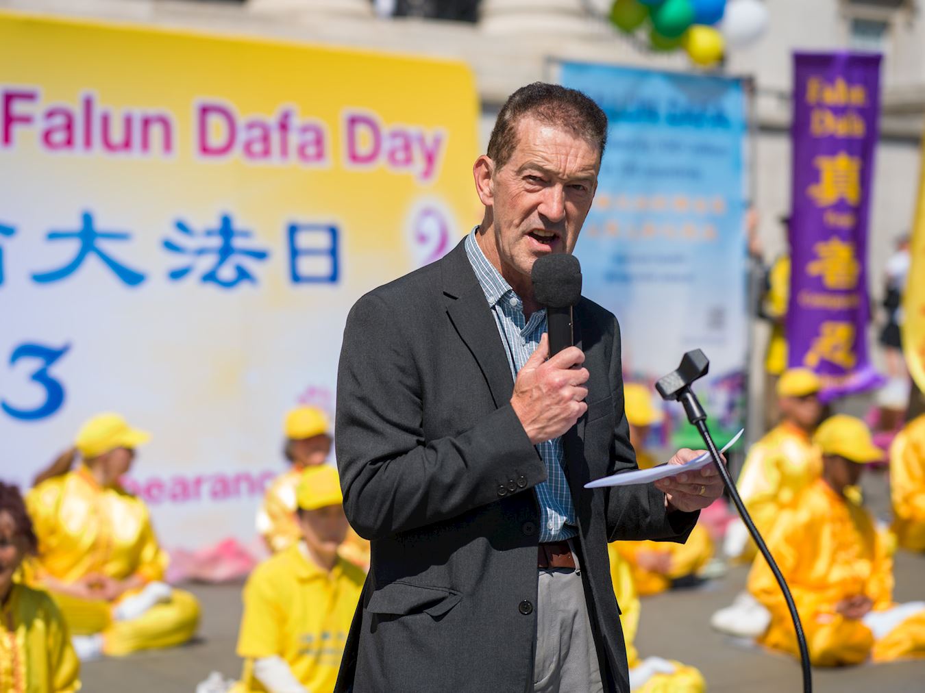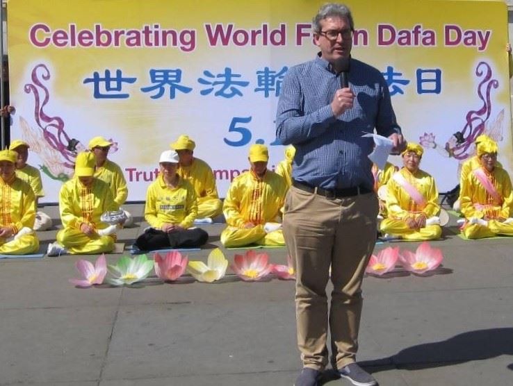 John Dee, predsjednik Prijatelja Falun Gonga Evropa, je u svom govoru rekao: „Falun Dafa ima dalekosežne posljedice na stotine miliona ljudi. Postao je važna sila u usmjeravanju čovječanstva ka dobroti, osvješćenju i pravdi. Dafa uči ljude da se prema drugima odnose s ljubaznošću, da sagledaju svoje nedostatke kada postoji problem, da ne krive ili zamjeraju drugima i da nastave tražiti istinu. „Iskreno se nadamo da takve dragocjene osobine mogu biti ključne za promjenu čovječanstva u budućnosti. Također bismo se željeli zahvaliti gospodinu Li Hongzhiju. Danas je rođendan Učitelja Lija. Iskreno mu želimo sretan rođendan!“