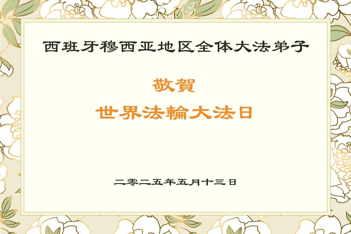 Falun Dafa praktikanti u Musiji, Španija, šalju svoje najlepše čestitke povodom Svetskog dana Falun Dafe i žele Učitelju srećan rođendan!