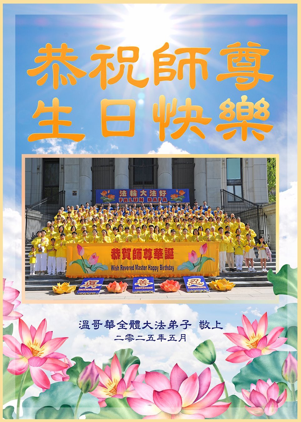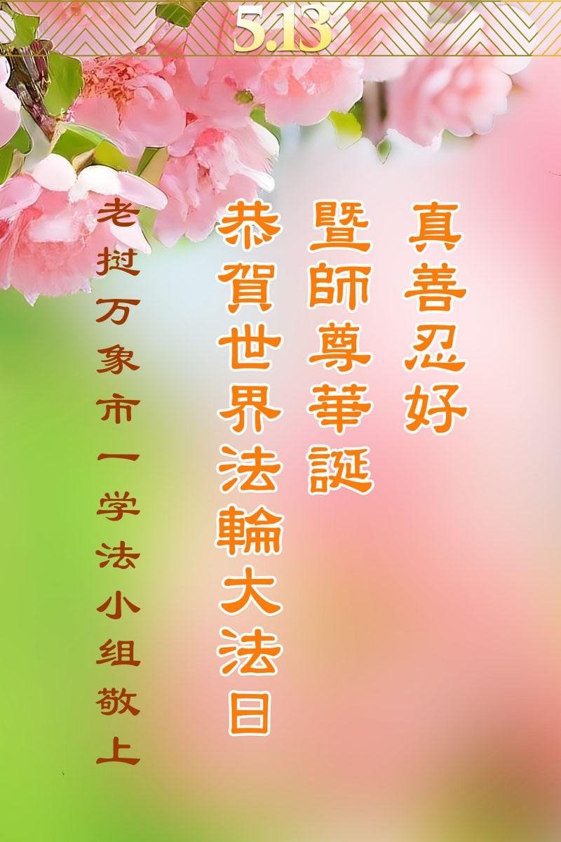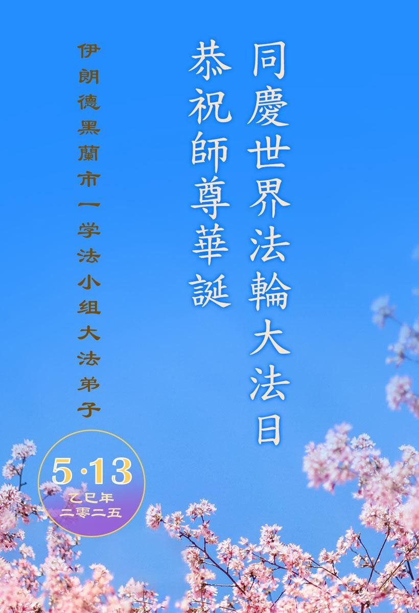 Čestitka od praktikanta iz Turske.Praktikanti u Philadelphiji slave Svjetski dan Falun Dafa.Čestitka od praktikanata iz Brazila.Francuski praktikanti poslali su svoju čestitku.Praktikanti iz Južne Koreje poslali su čestitku.Praktikanti u Vancouveru, Kanada, slave Svjetski dan Falun Dafa i žele Učitelju Li-u sretan rođendan.