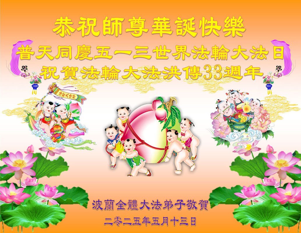 Praktikanti u Danskoj zahvalni su Učitelju na suosjećanju.Praktikanti u Hrvatskoj i Srbiji poslali su čestitke.Praktikanti u Vijetnamu poslali su čestitku.Praktikanti u Iranu slave Svjetski dan Falun Dafa.Praktikanti u Rusiji slave Svjetski dan Falun Dafa.Praktikanti u Poljskoj žele Učitelju Li-u sretan rođendan!Čestitka od praktikanata iz Singapura.Čestitke su stigle od praktikanata iz Ujedinjenog Kraljevstva.Praktikanti u Finskoj slave Svjetski dan Falun Dafa.Čestitke su stigle od praktikanata iz Novog Zelanda.Praktikanti u Nizozemskoj žele Učitelju Li-u sretan rođendan!Njemački praktikanti su rekli da će se bolje kultivirati slijedeći principe Istinitosti-Suosjećanja-Tolerancije.