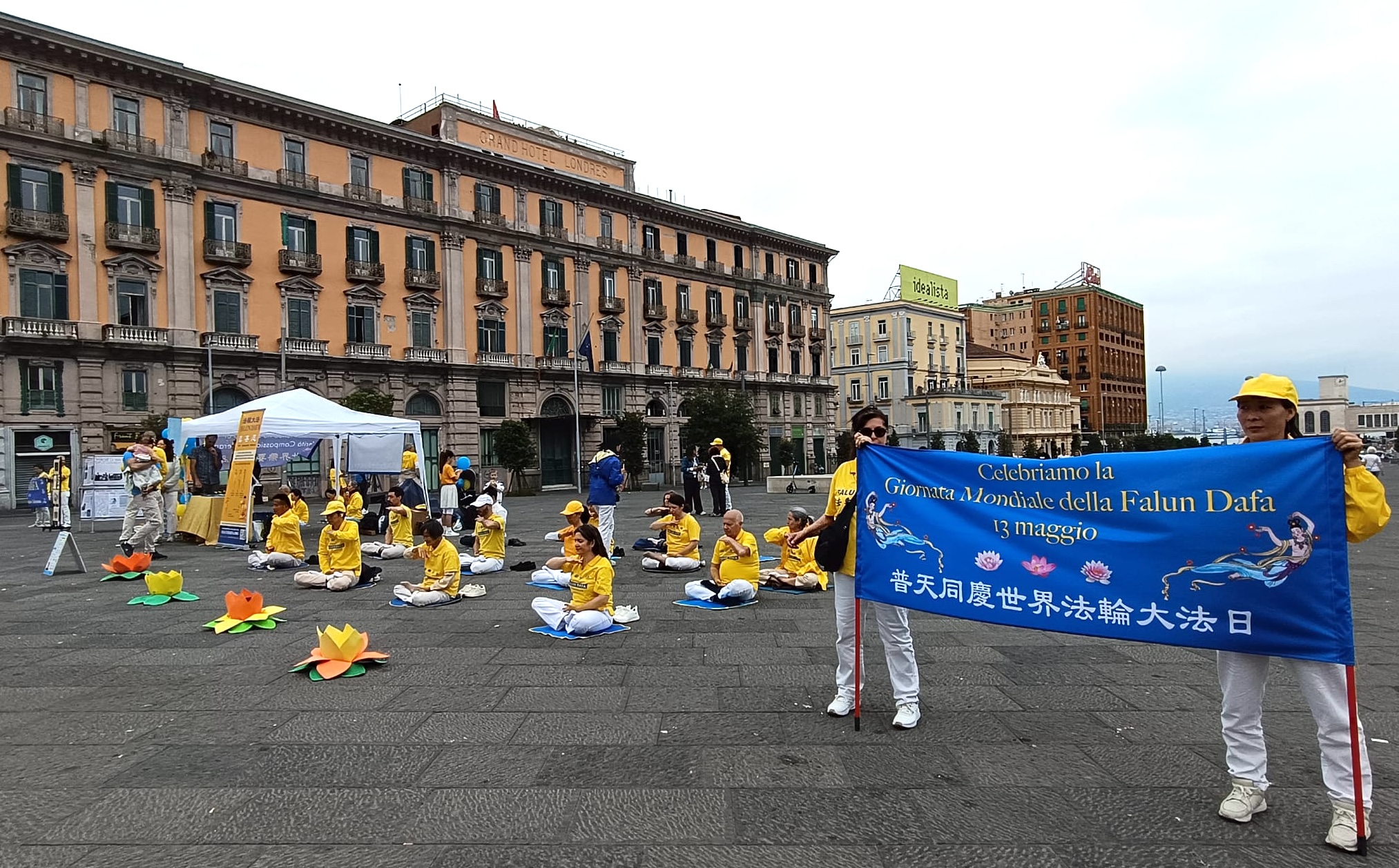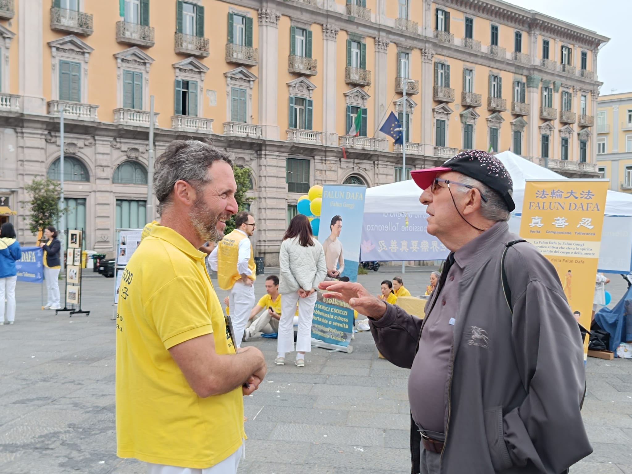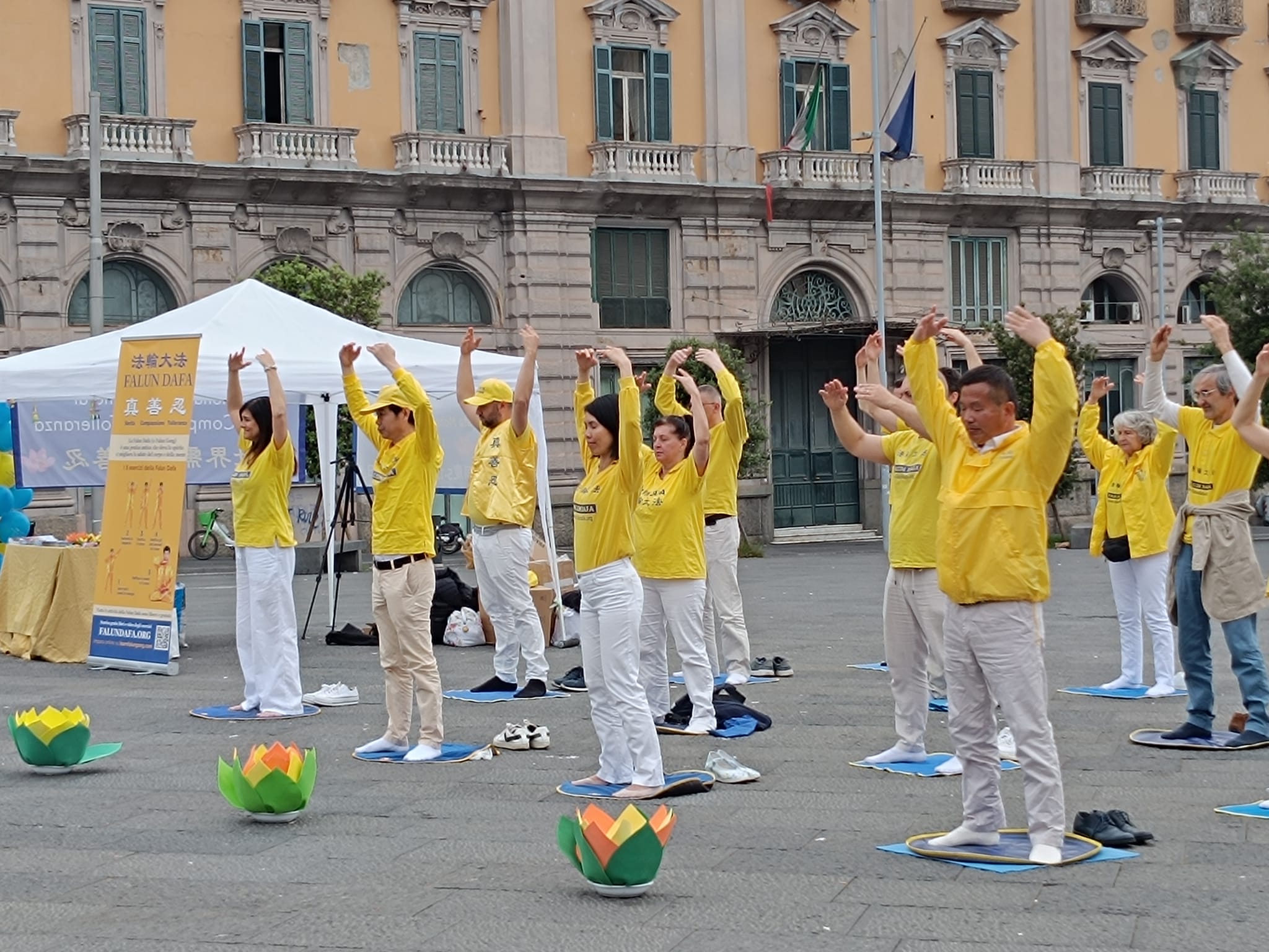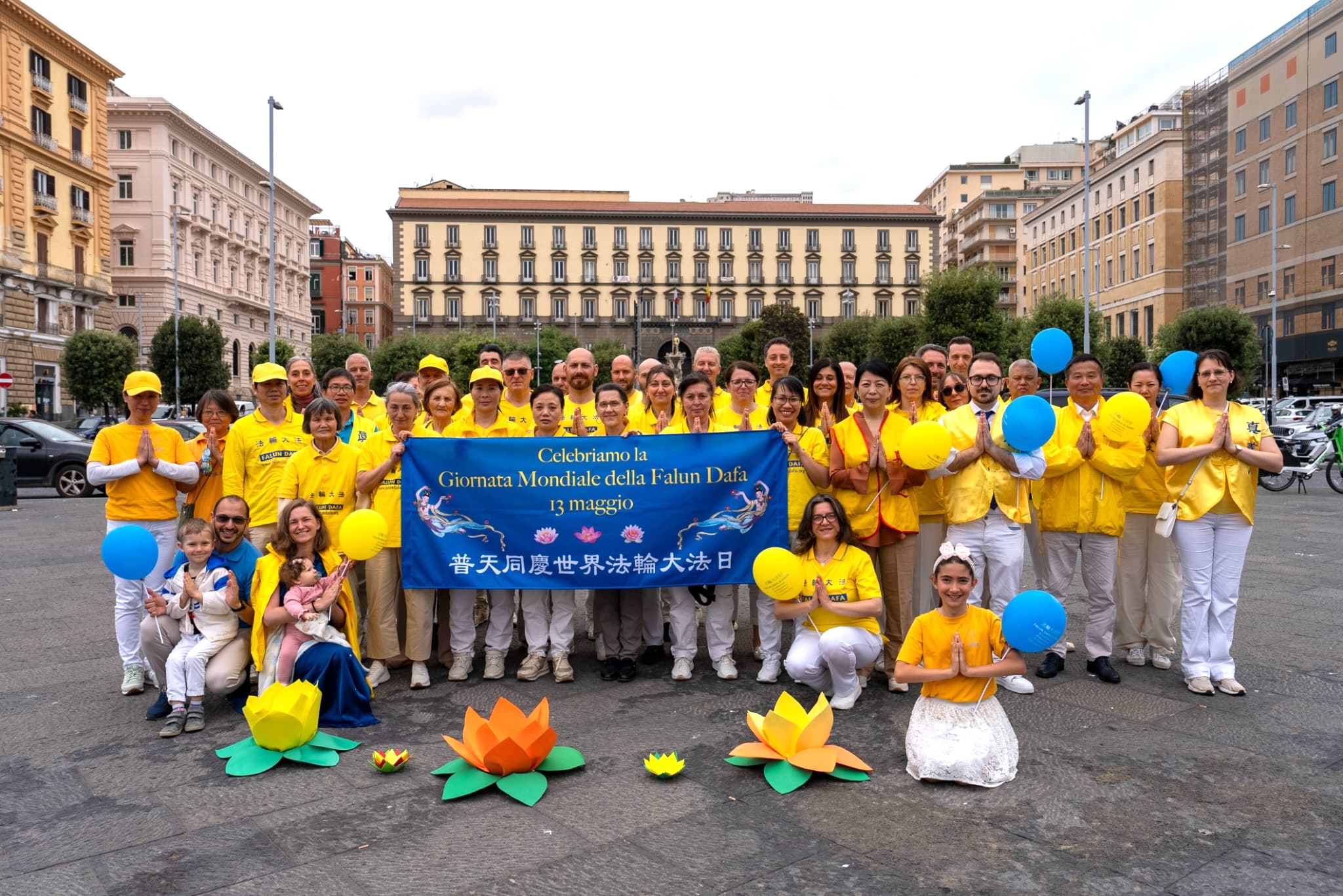 U čast Svetskog dana Falun Dafa i sa željom da čestitaju rođendan osnivaču, Učitelju Li Hongžiju, praktikanti Dafa iz celog Italija organizovali su grupne vežbe i aktivnosti ispred zgrade gradske uprave u Napulju 11. maja 2025. godine. Napulj je u južnom delu Italije, treći po veličini grad Italije i najgušće naseljeni grad u Evropi.