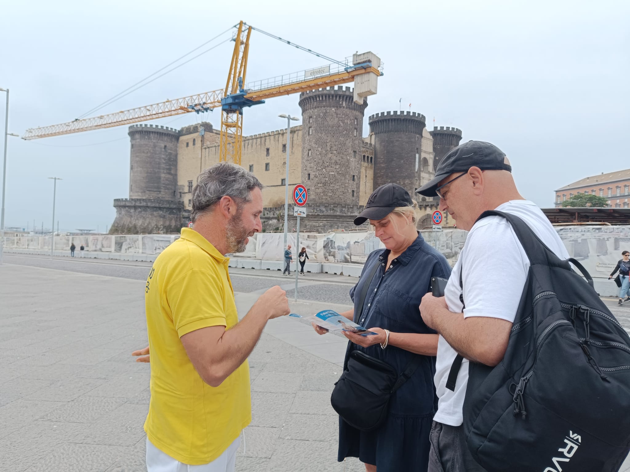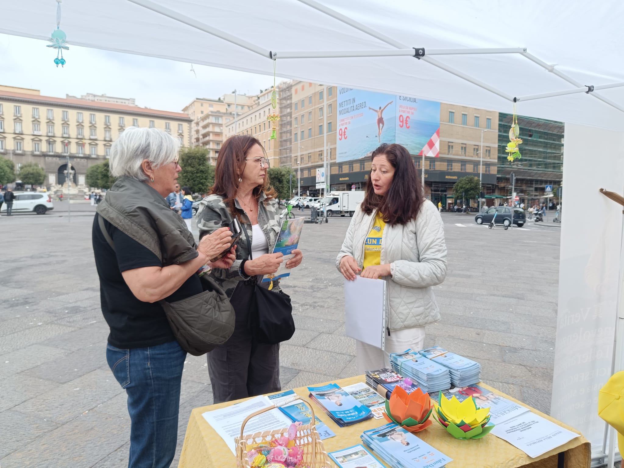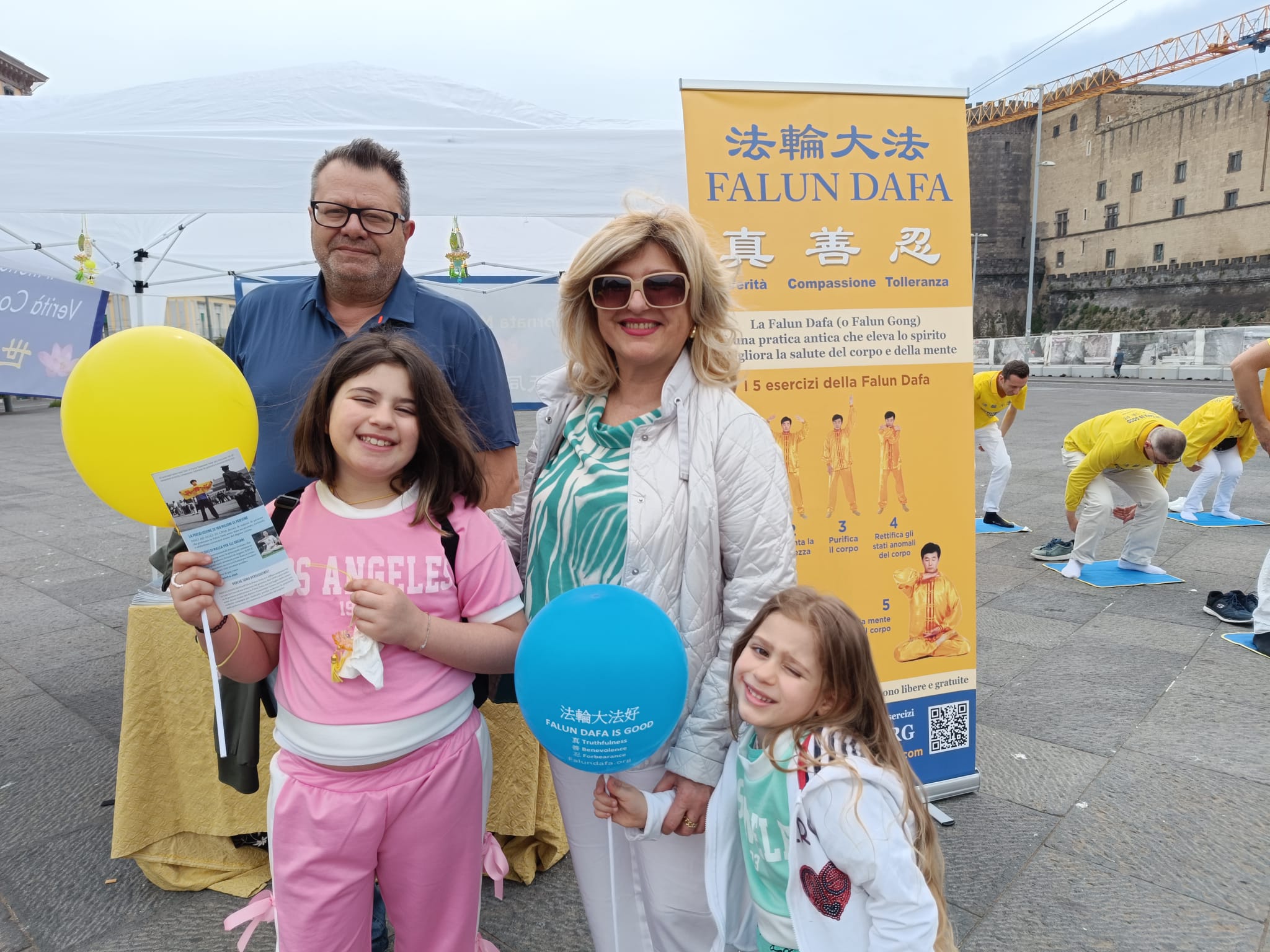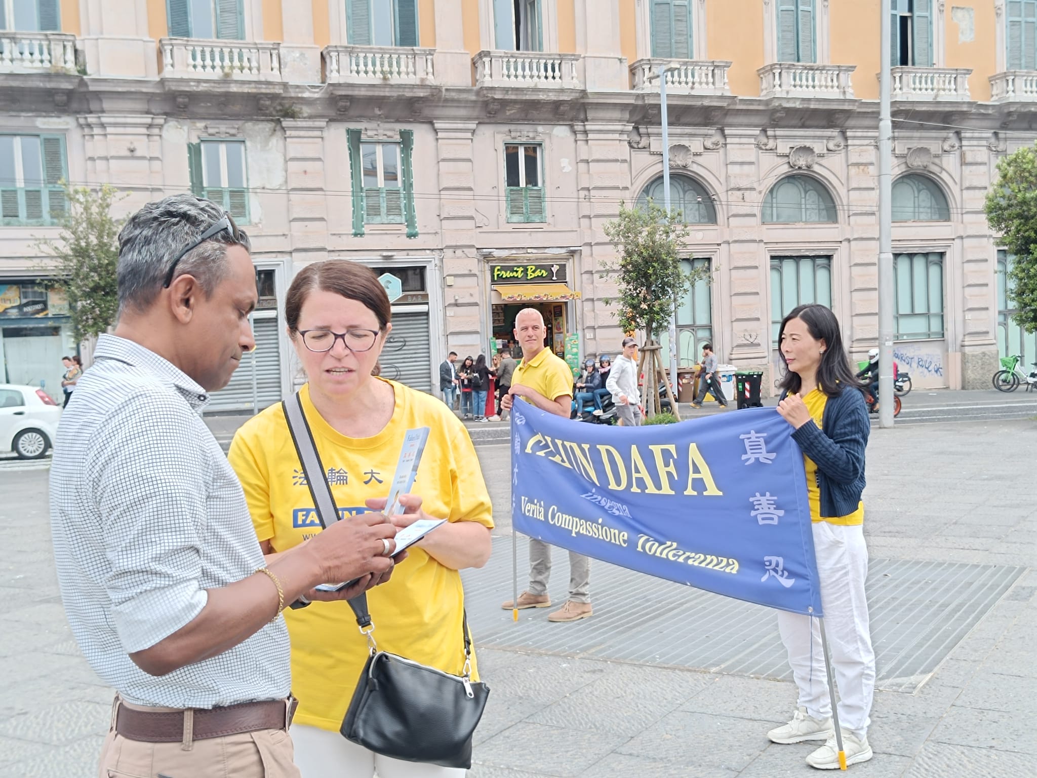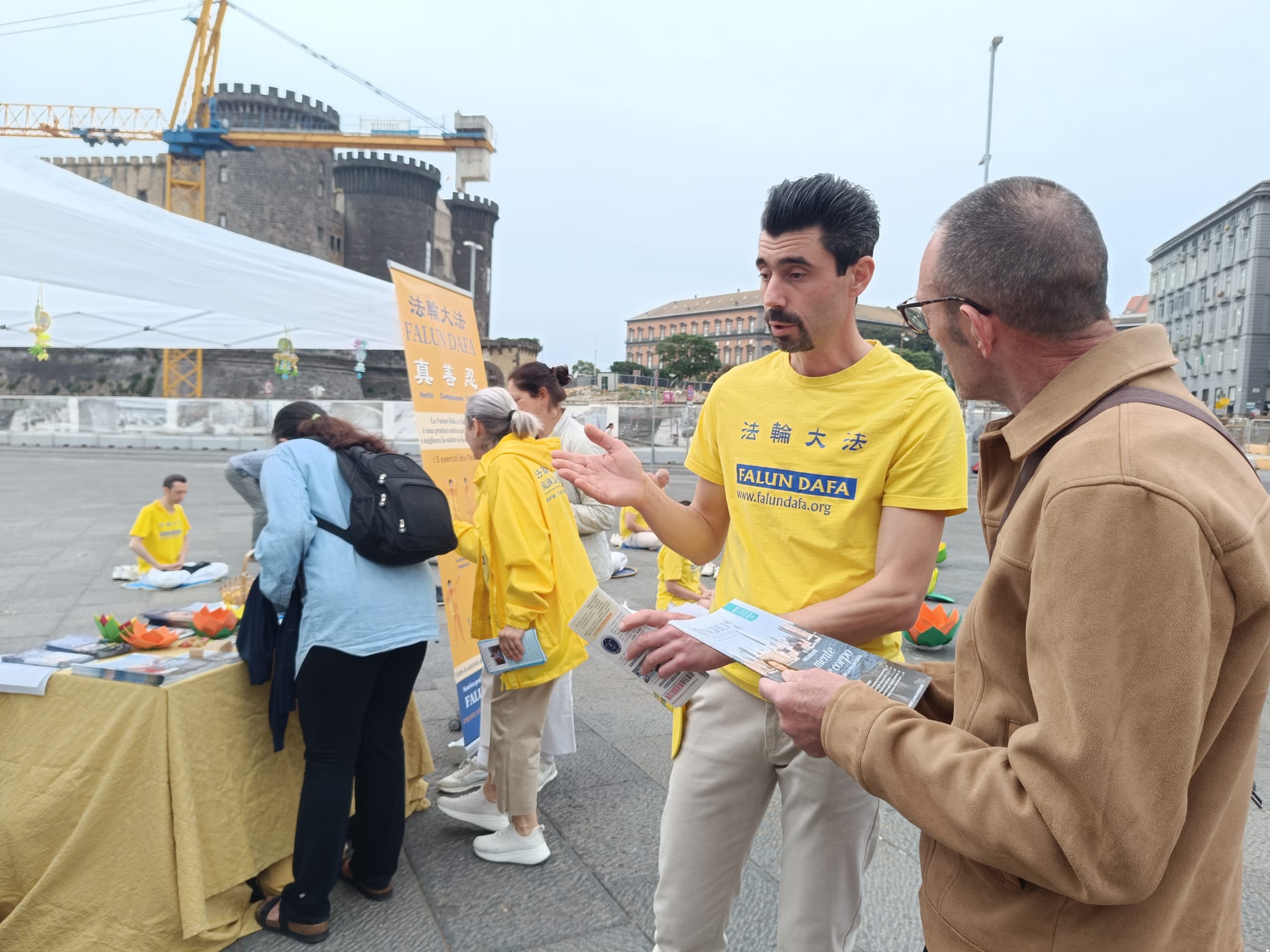 U čast Svetskog dana Falun Dafa i sa željom da čestitaju rođendan osnivaču, Učitelju Li Hongžiju, praktikanti Dafa iz celog Italija organizovali su grupne vežbe i aktivnosti ispred zgrade gradske uprave u Napulju 11. maja 2025. godine. Napulj je u južnom delu Italije, treći po veličini grad Italije i najgušće naseljeni grad u Evropi.